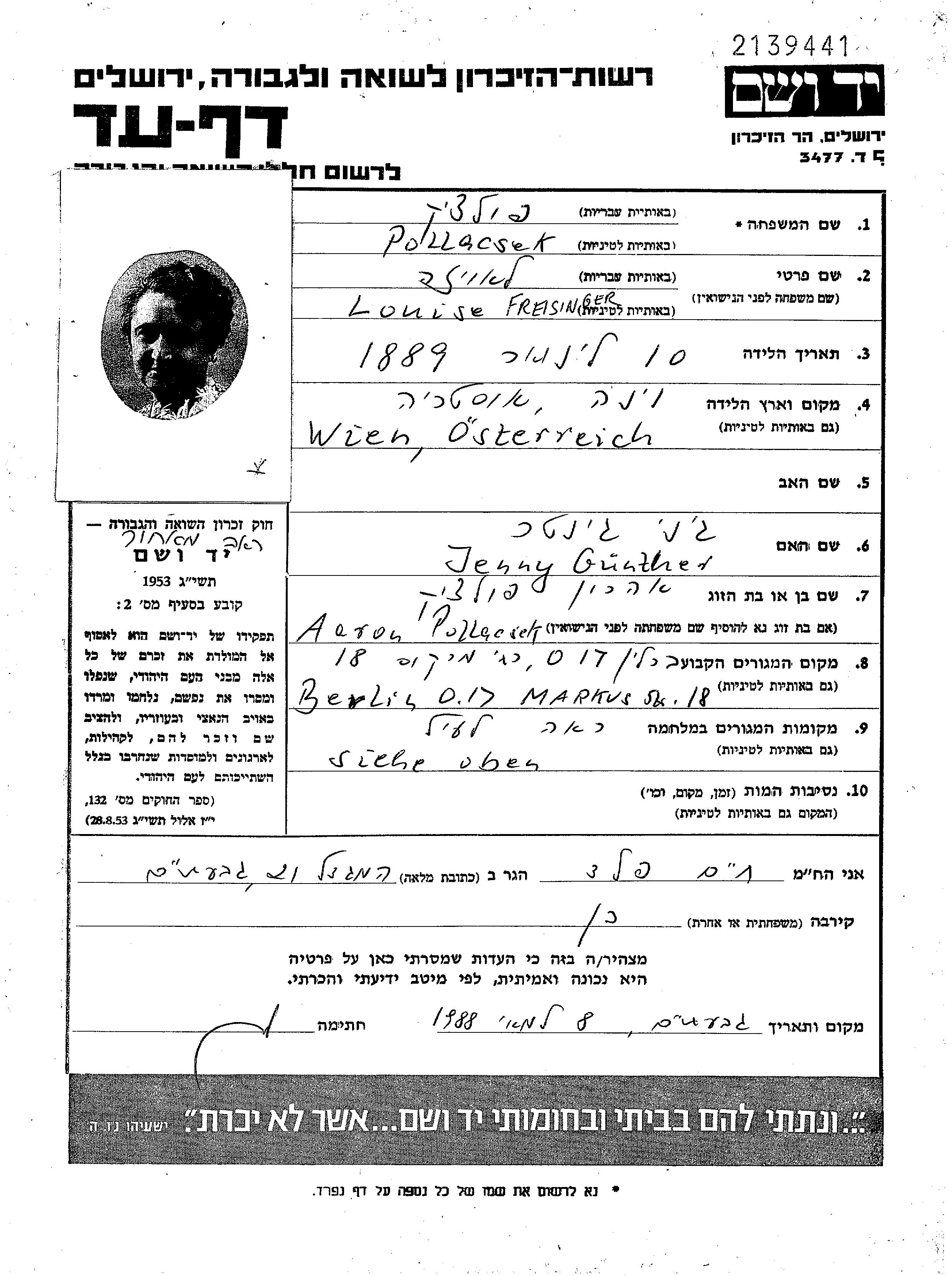 Луиз Поллачек, девичья фамилия Фрайзингер, место рождения: Вена, Австрия. Место жительства до войны: Берлин, Германия.