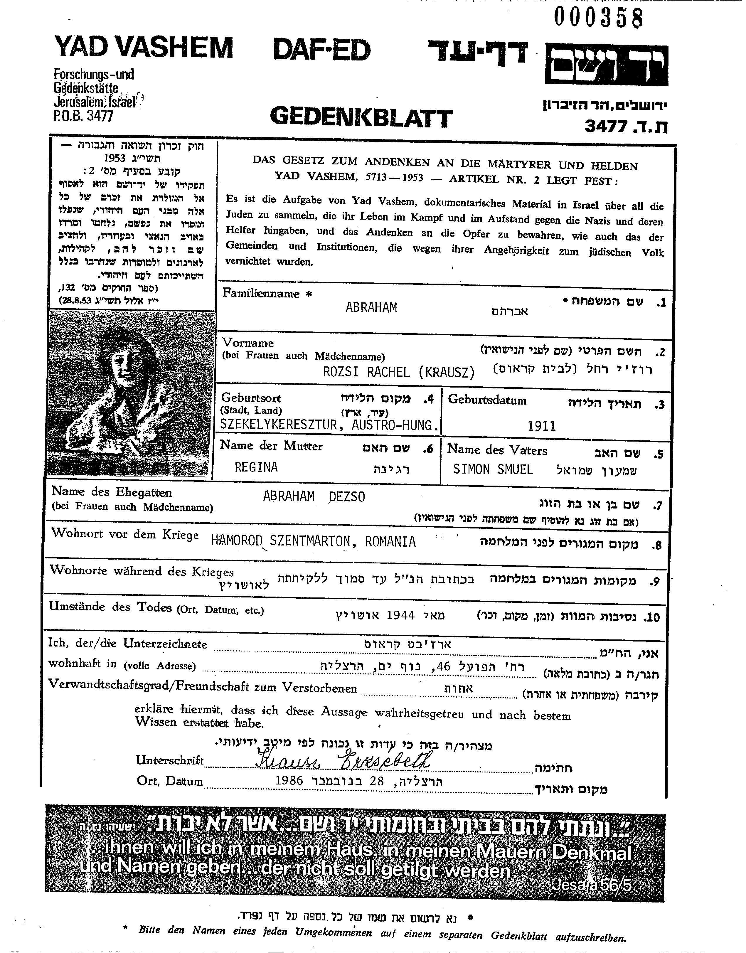 Рожи Рахель Абрахам, девичья фамилия Краус, место рождения: Кристур, Румыния. Место жительства до войны: Martinis, Румыния.
