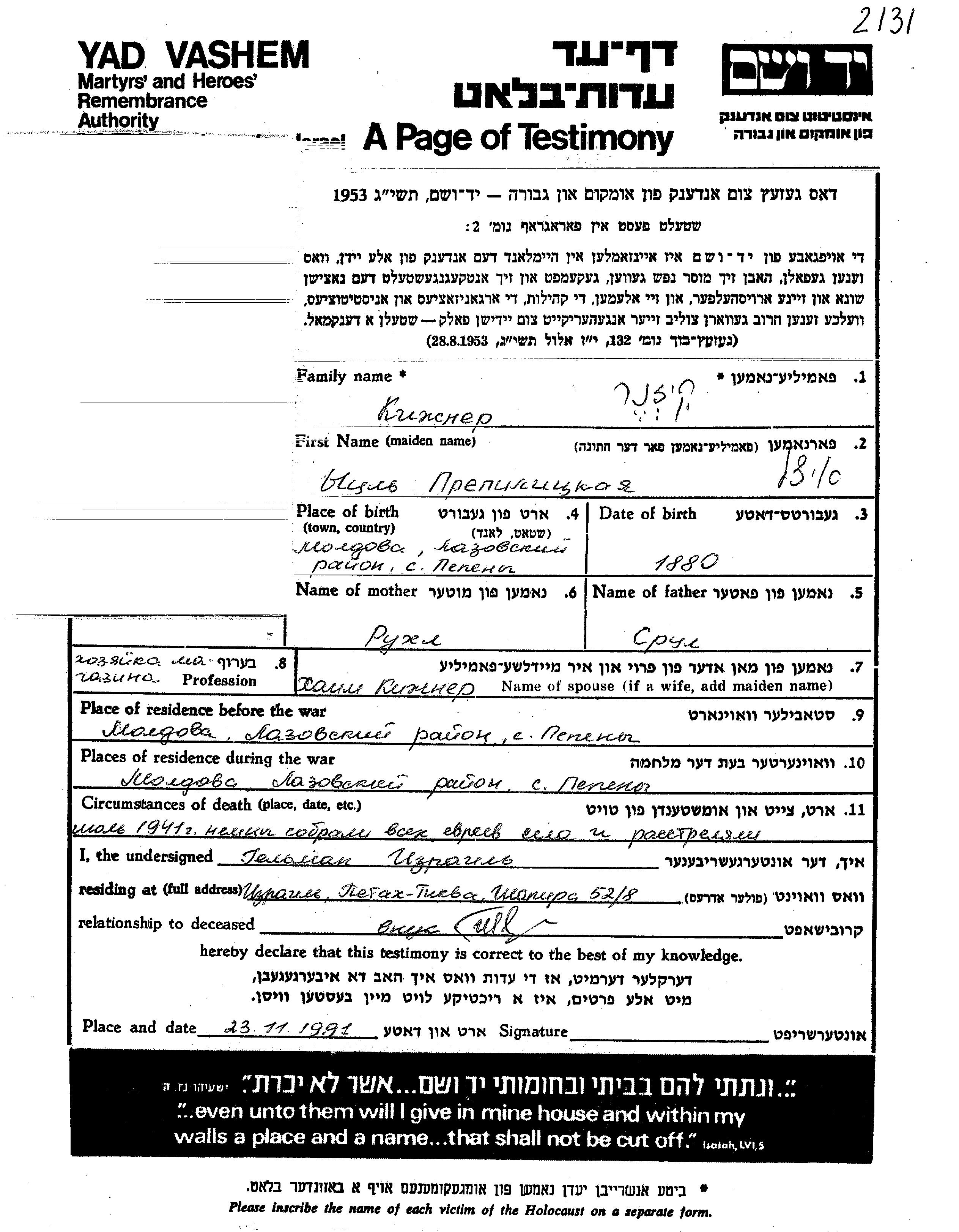 Яд Вашем - Листы свидетельских показаний Мемориального фонда