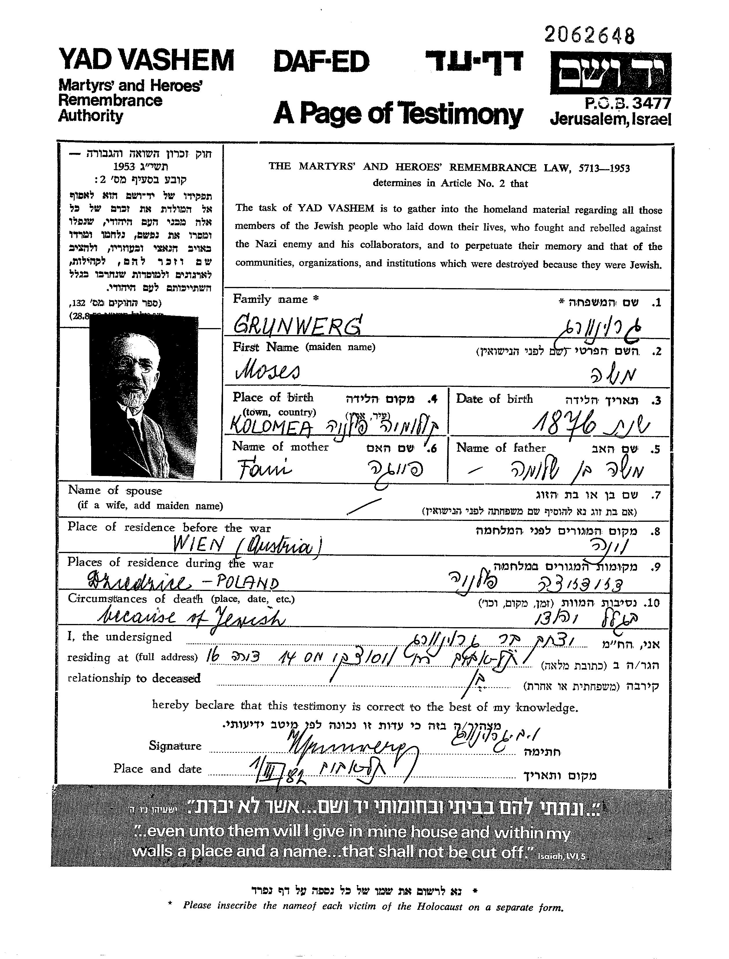 Грунверг | Мозес | 1876 | Вена, Австрия | Лист свидетельских показаний |