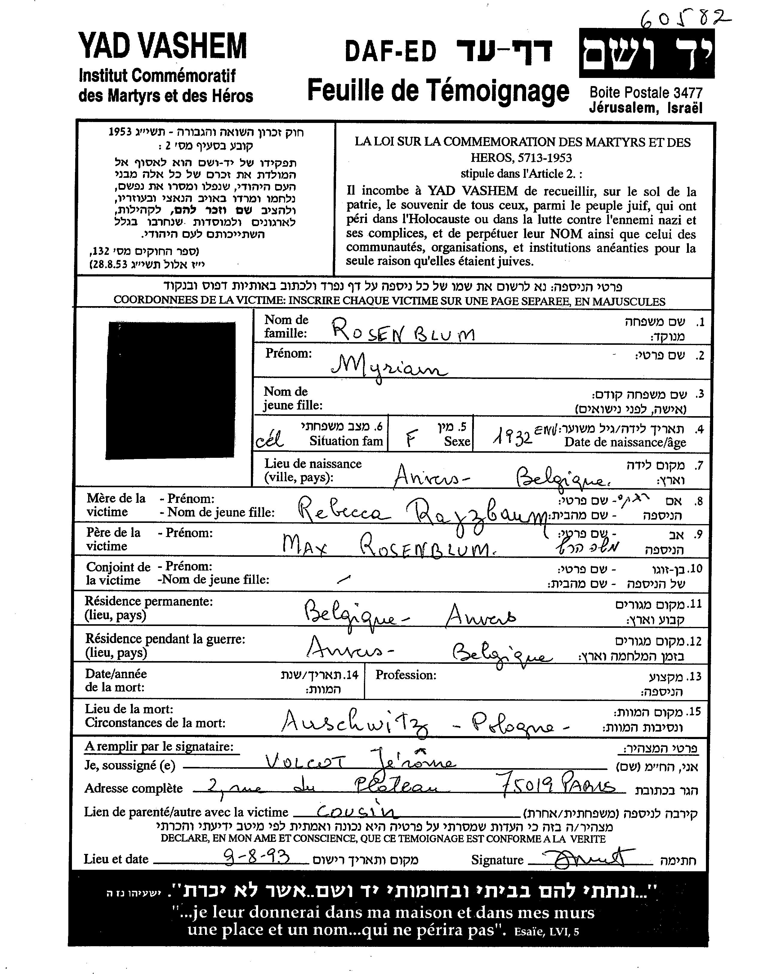 Розенблюм | Мирьям | 1932 | Антверпен, Бельгия | Лист свидетельских показаний |