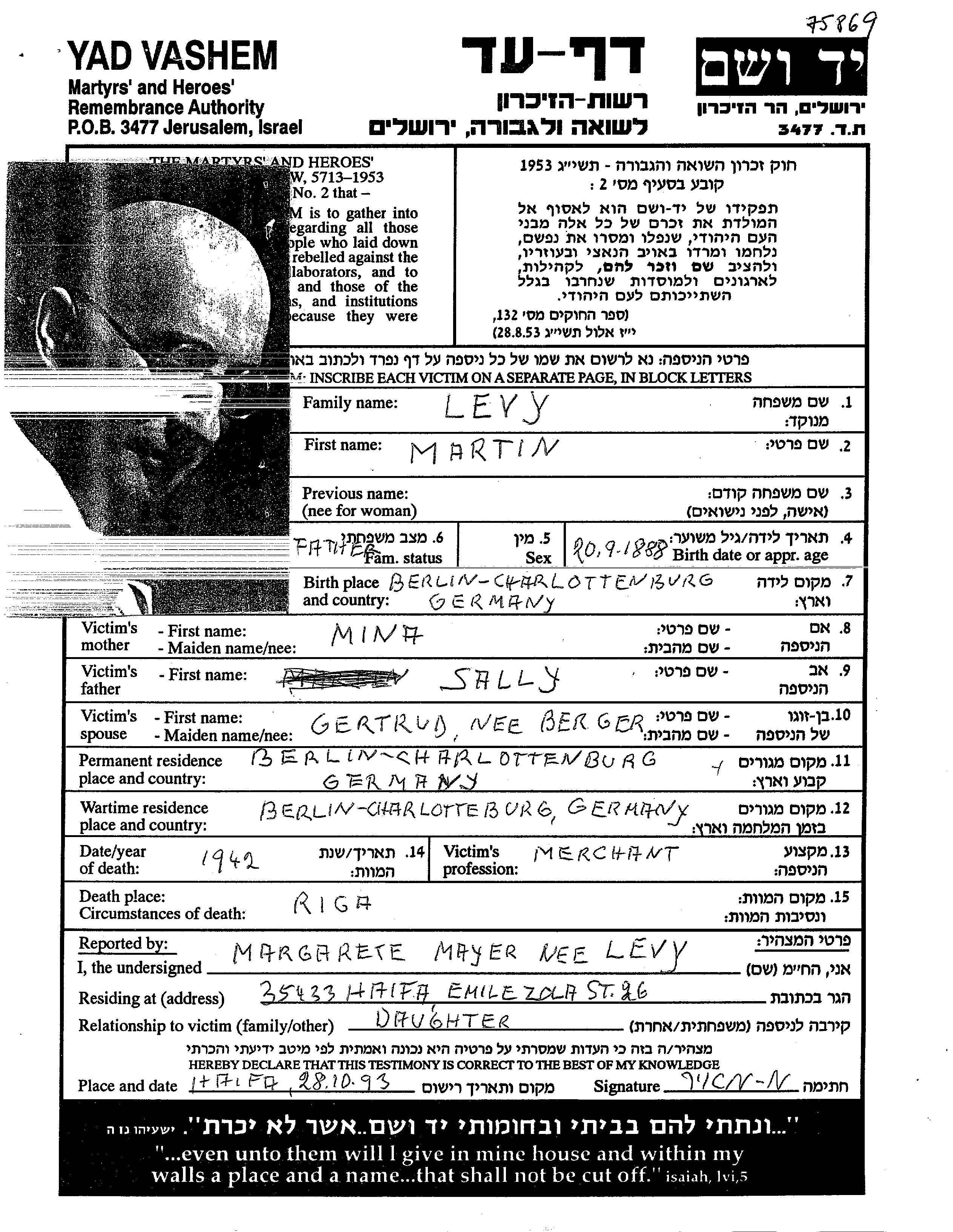 Мартин Леви, место рождения: Берлин, Германия. Торговец / торговка. Место жительства до войны: Берлин, Германия.