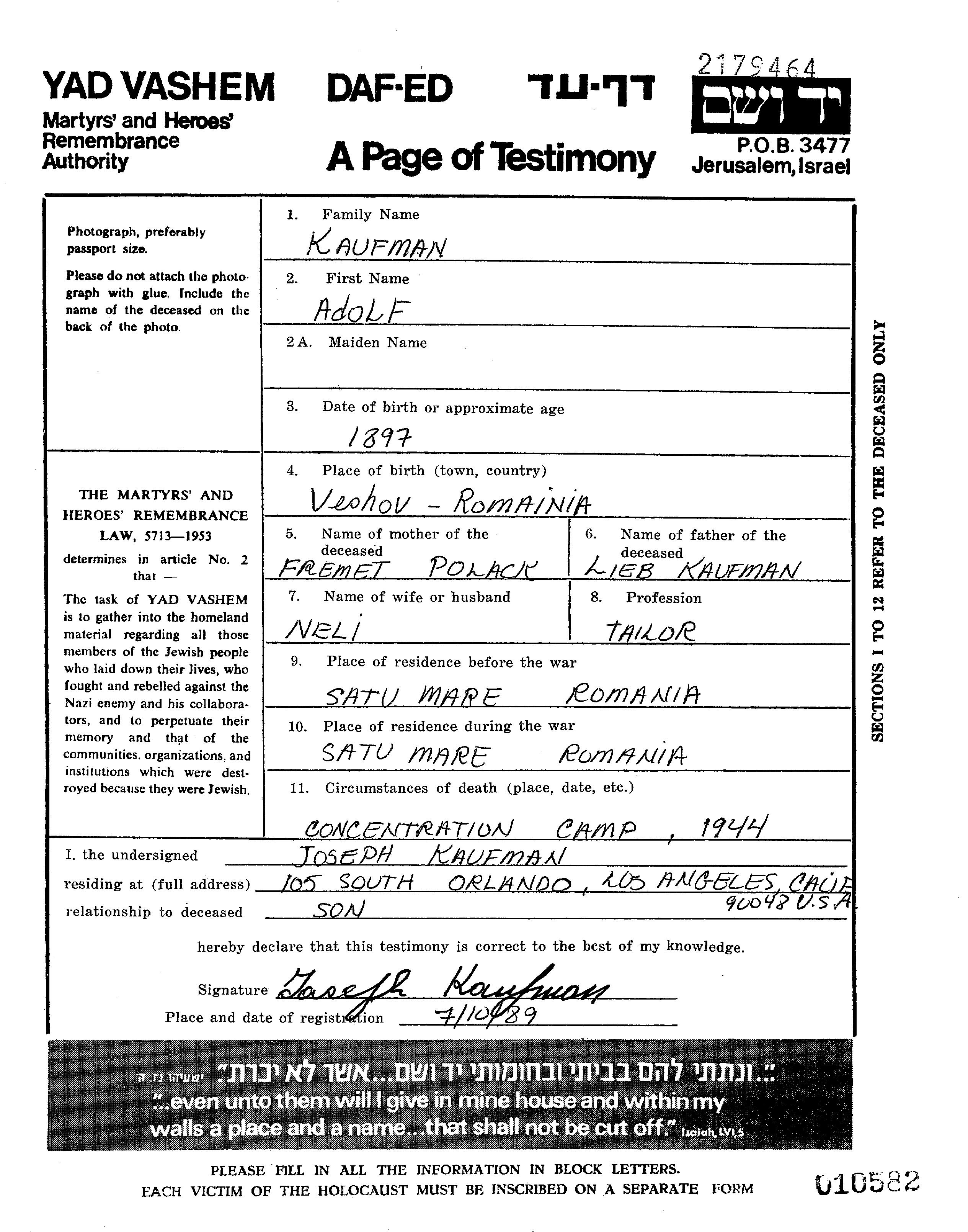 Кауфман Авром Якоб Адольф 1897 Сатмар, Румыния Лист свидетельских показаний