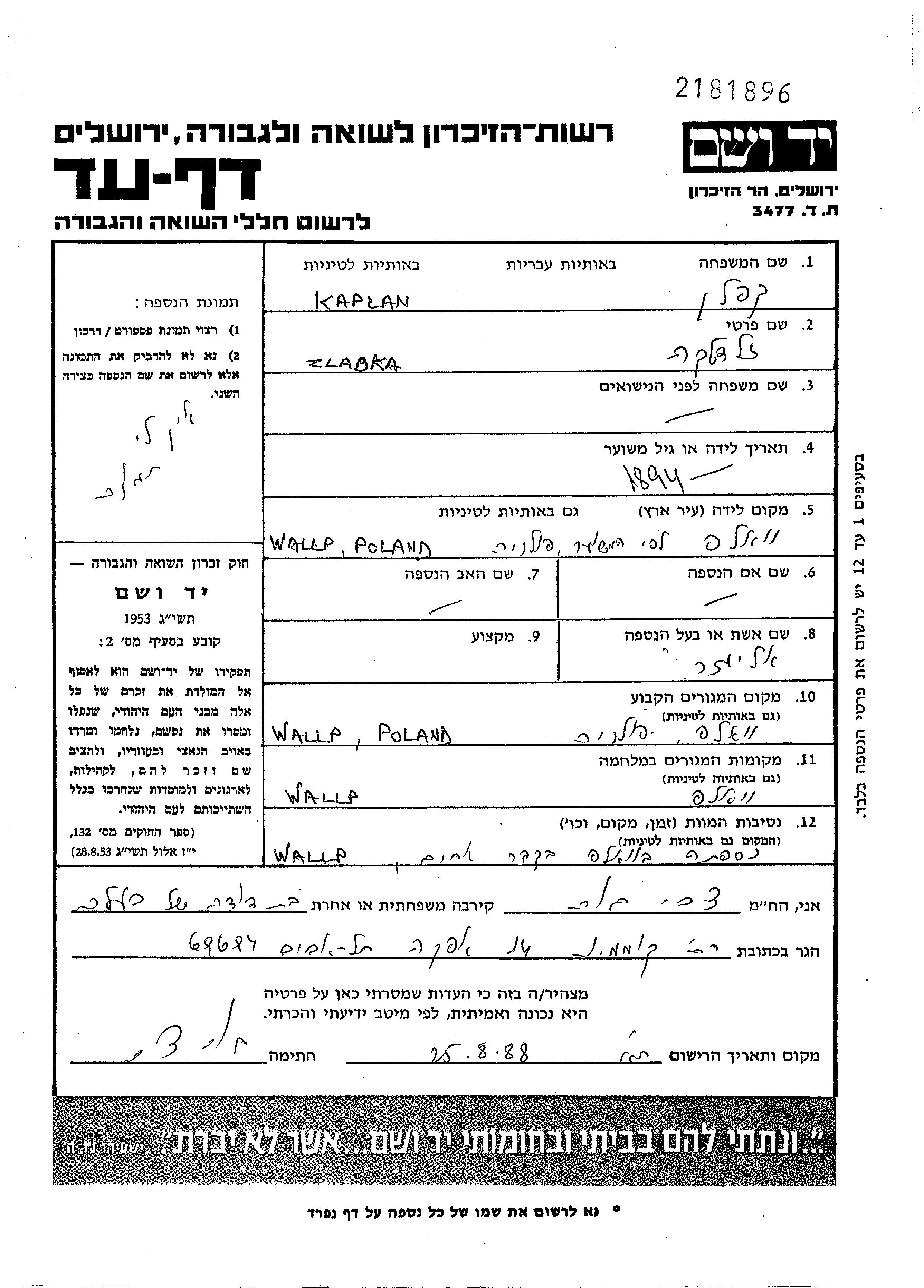 Зладка Злата Каплан, место рождения: Волпа, Польша. Женат / замужем. Место жительства до войны: Волпа, Польша. Место во время войны: Волпа, Польша.