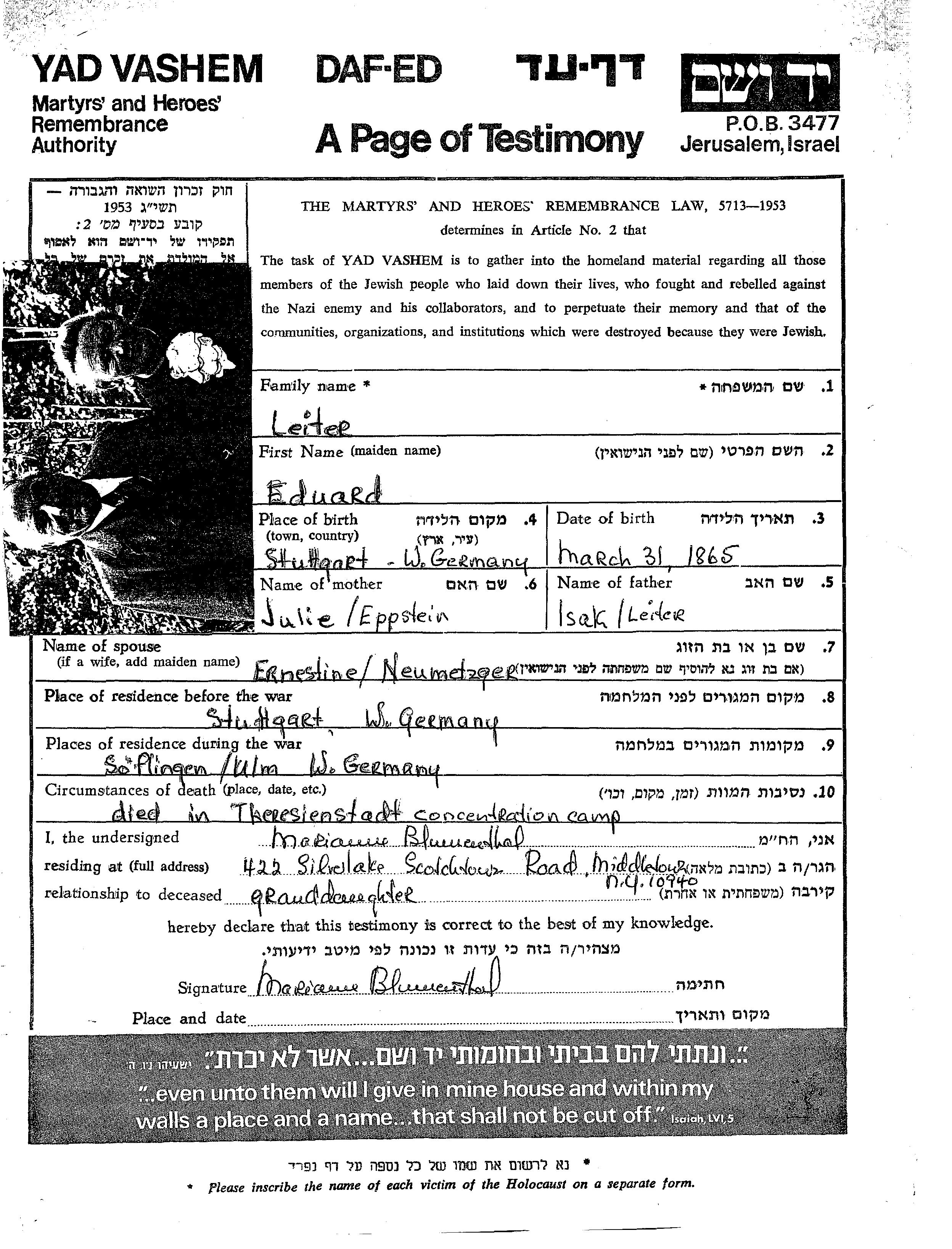 Эдуард уничтожен в период Шоа. место смерти: Терезиенштадт, Чехословакия.