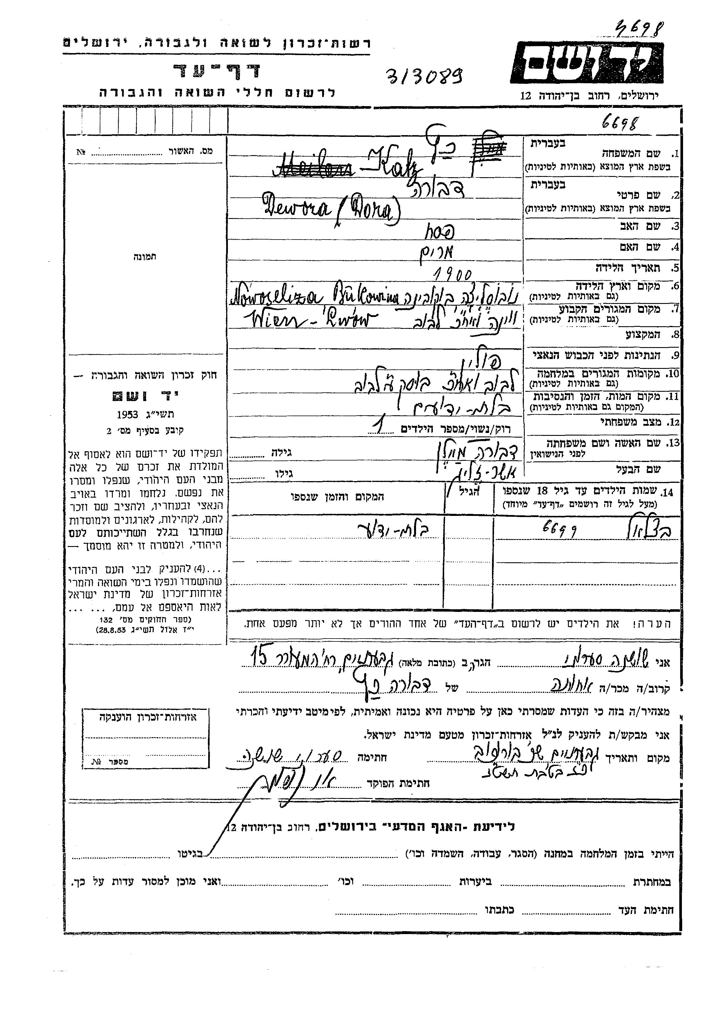 Дора Двора Кац, девичья фамилия Майлен, место рождения: место не указано. Место жительства до войны: Львов, Польша.