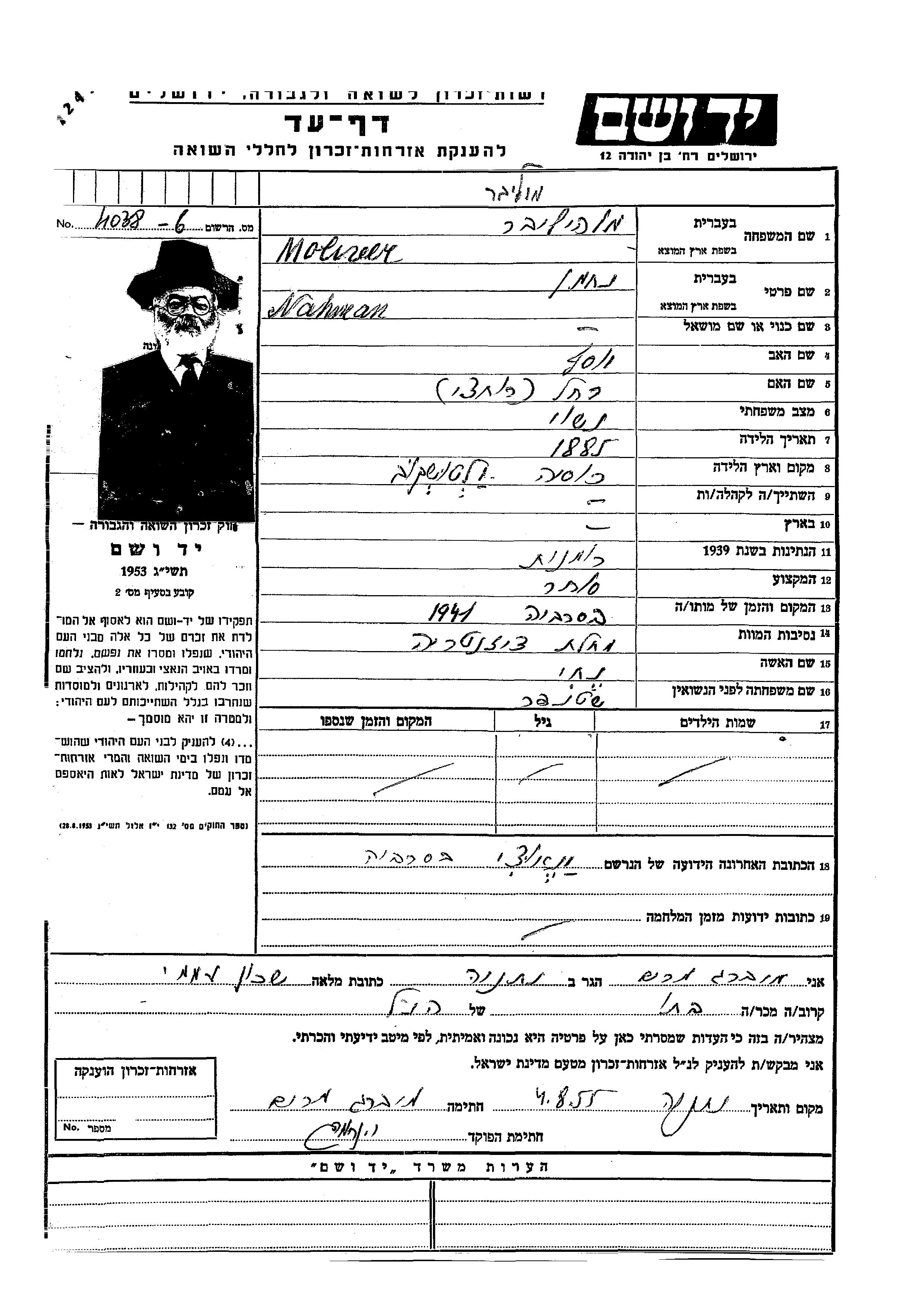 Моливер Нахман 1885 Янауцы, Румыния Лист свидетельских показаний