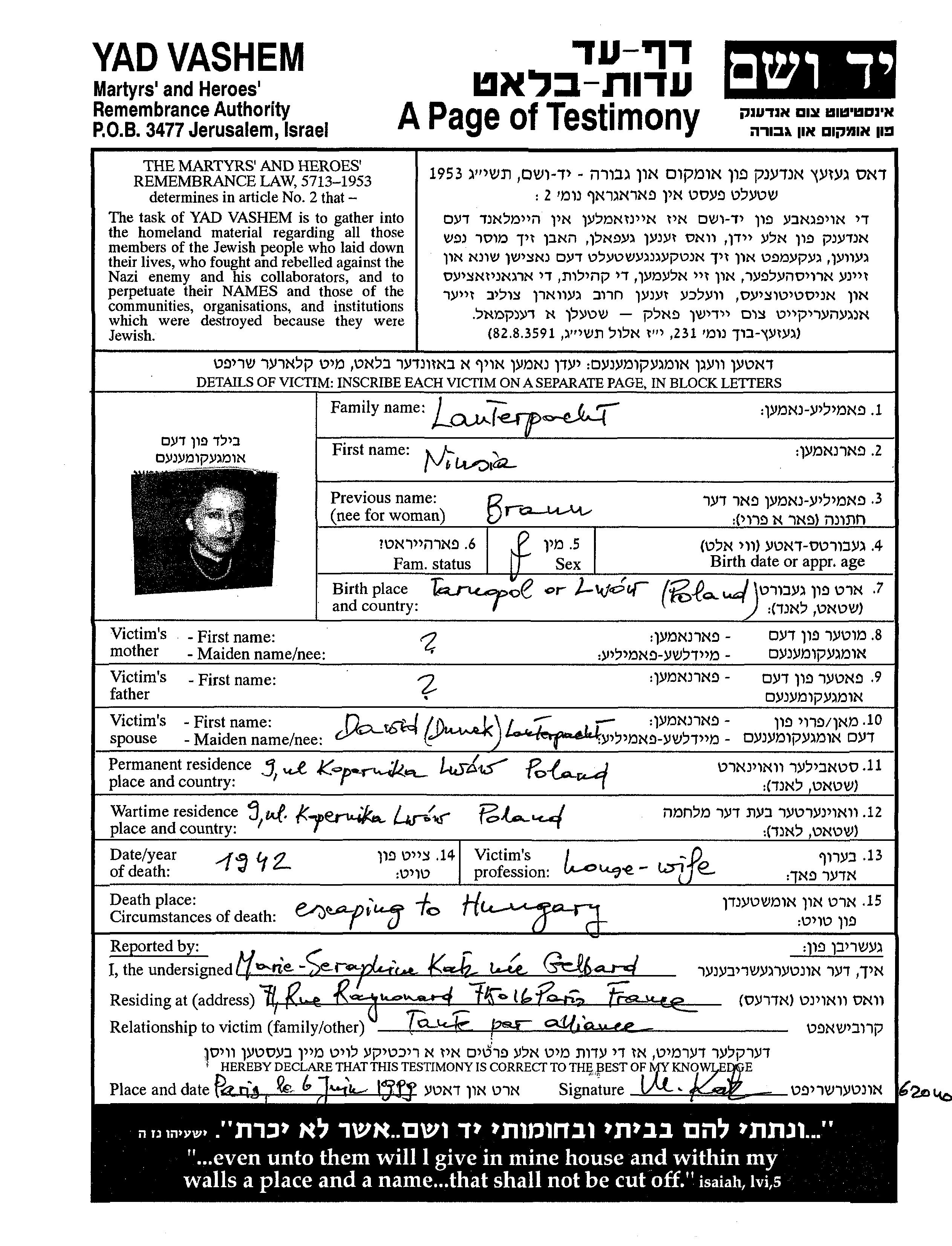 Нюся Лаутерпахт, девичья фамилия Бранн, место рождения: Тарнополь, Польша. Домохозяйка. Место жительства до войны: Львов, Польша.