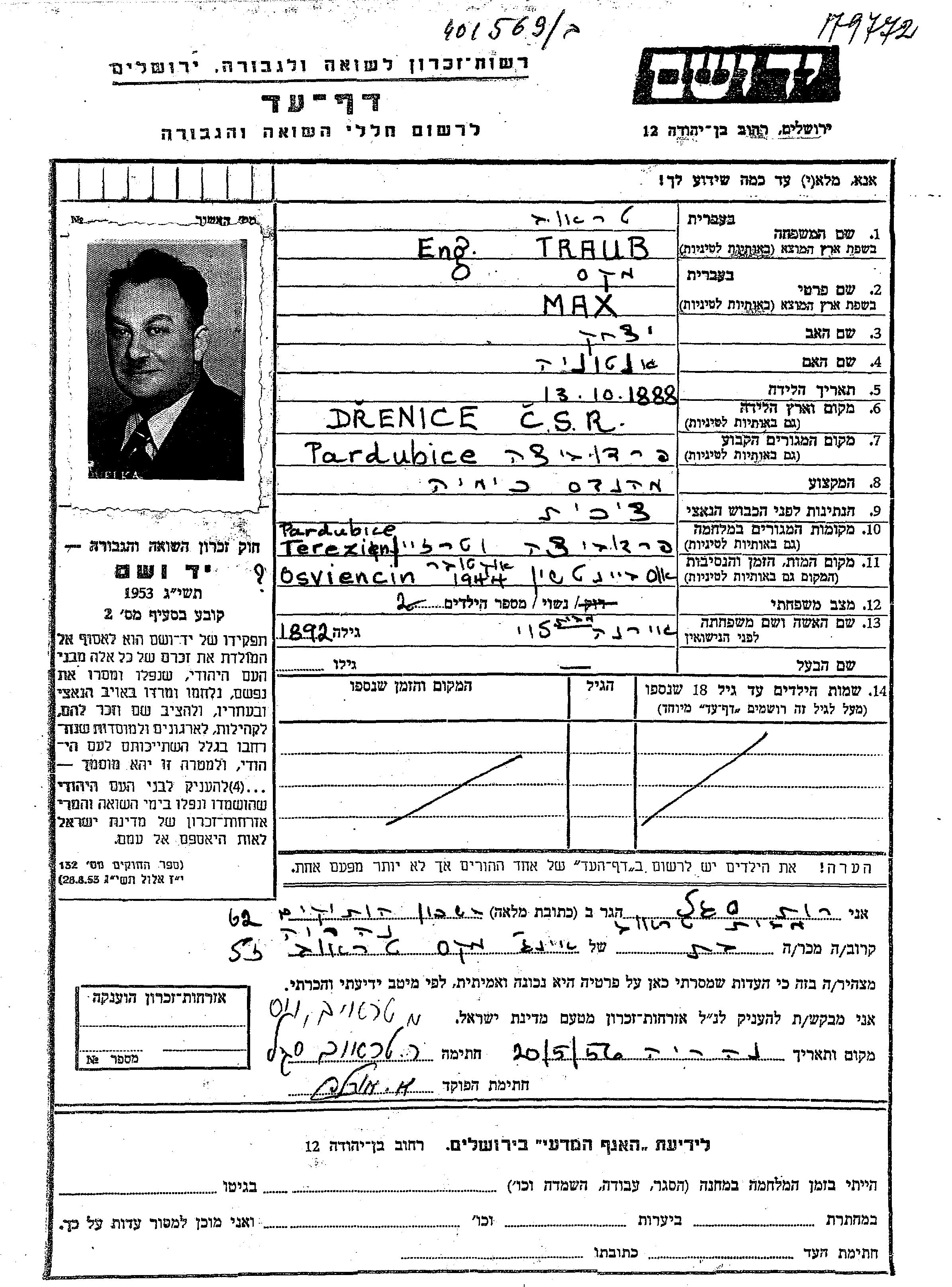 Макс Трауб, место рождения: Држенице, Чехословакия. Инженер. Место жительства до войны: Пардубице, Чехословакия.