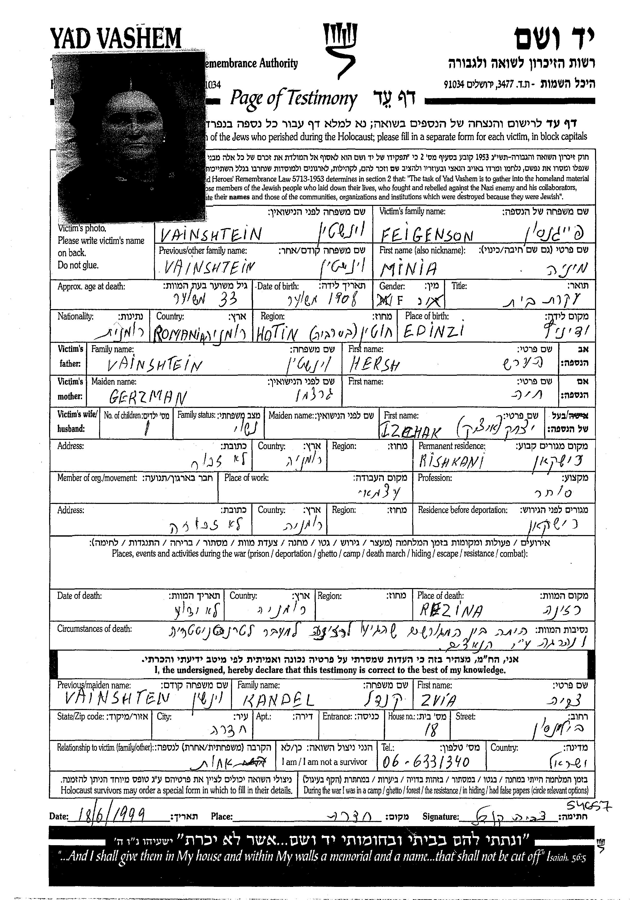 | Фейгенсон | Миня | 1908 | Ришкани, Румыния | Лист свидетельских показаний |