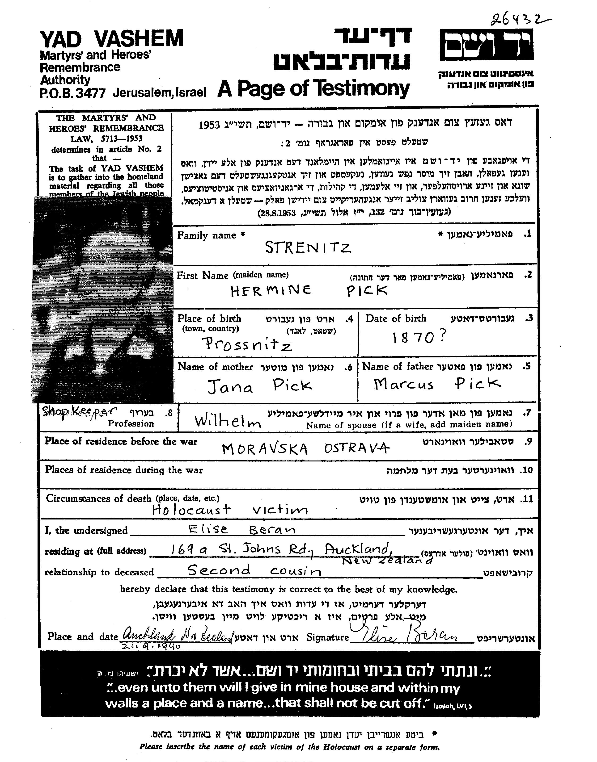 Хермине Штрениц, девичья фамилия Пик, место рождения: Простеёв, Чехословакия. Место жительства до войны: Моравска Острава, Чехословакия.