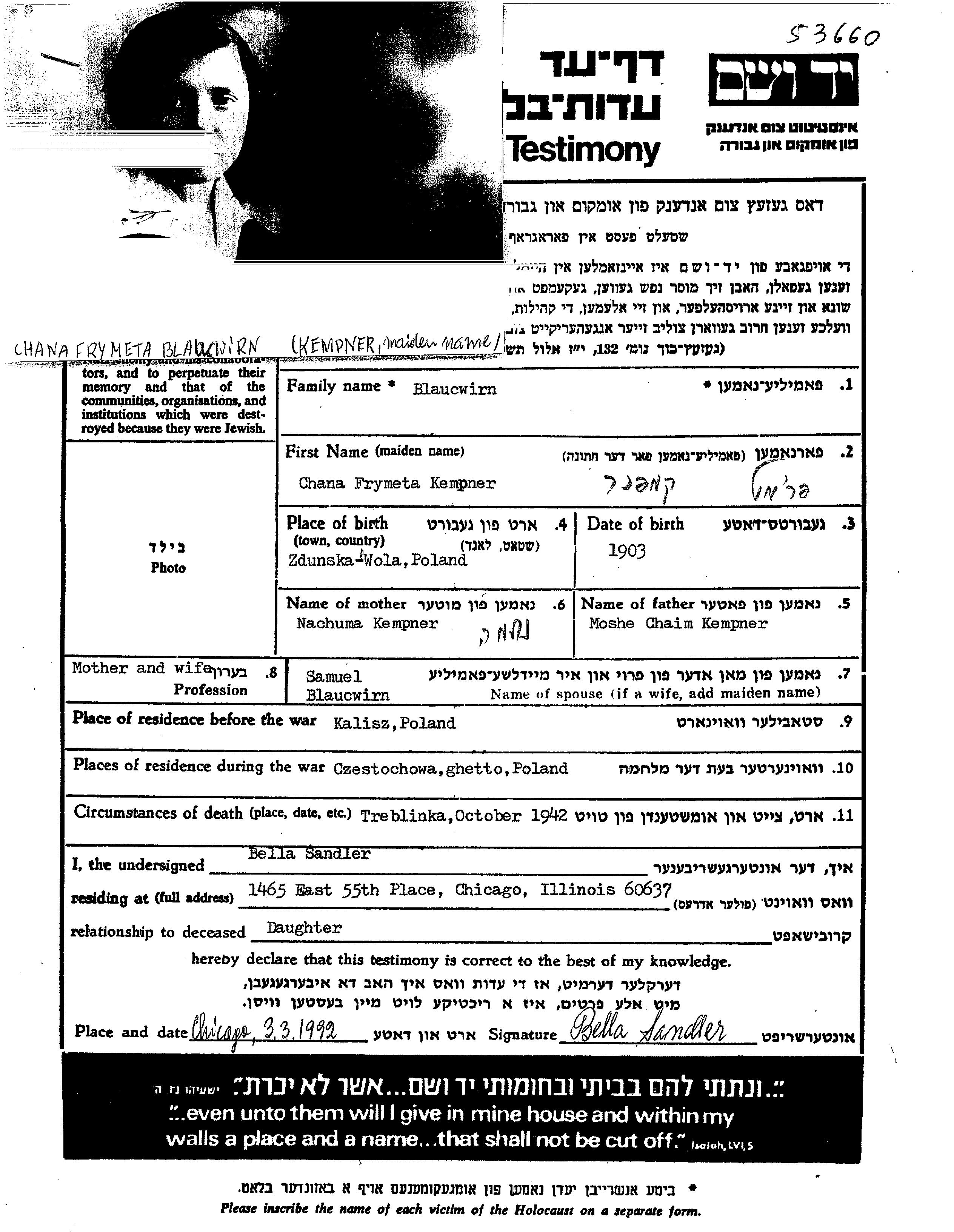 | Блауцвирн | Хана Фримета | 1903 | Калиш, Польша | Лист свидетельских показаний |