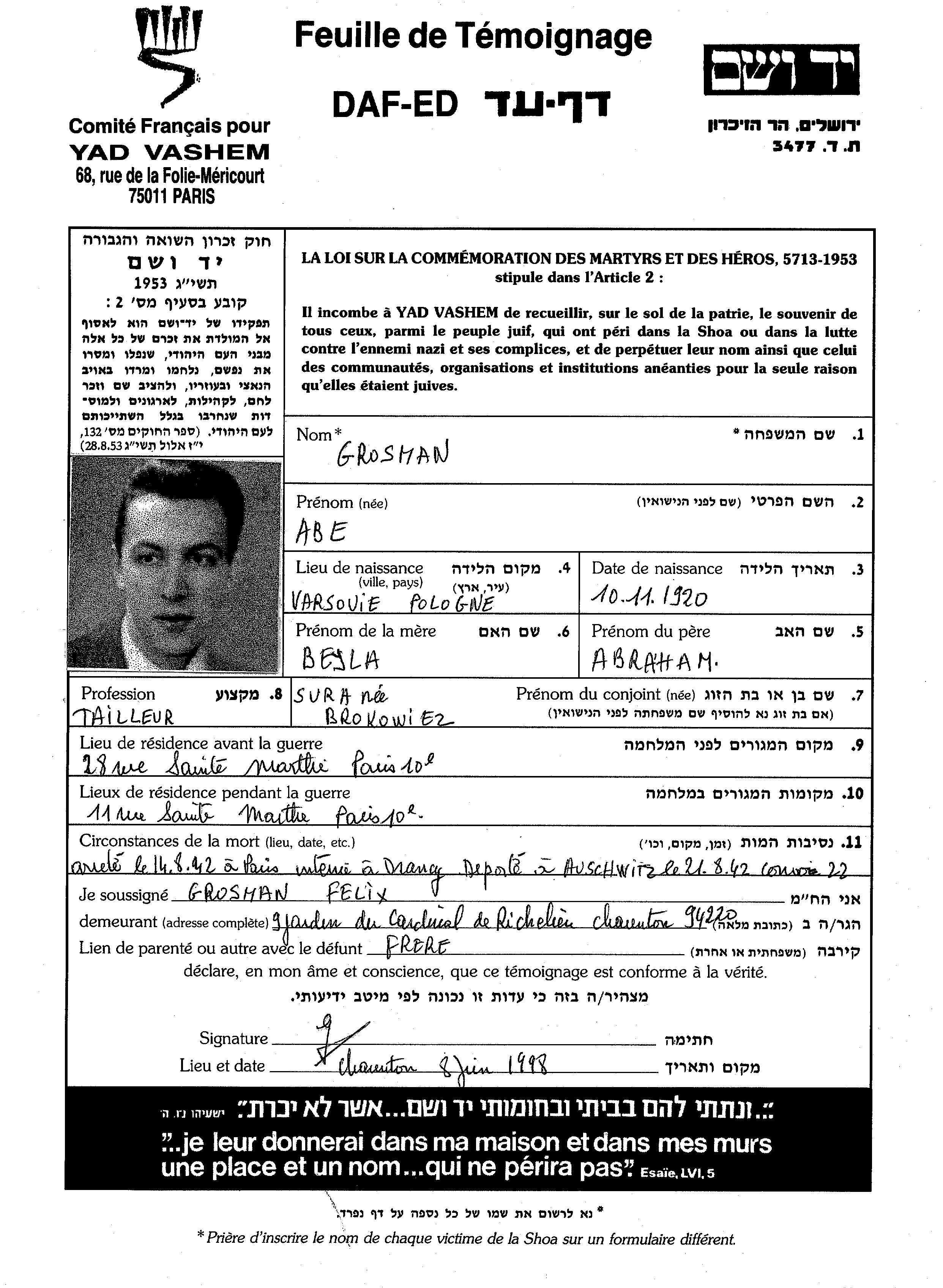 Абе Гросман, место рождения: Варшава, Польша. Портной / портниха. Место жительства до войны: Париж, Франция.