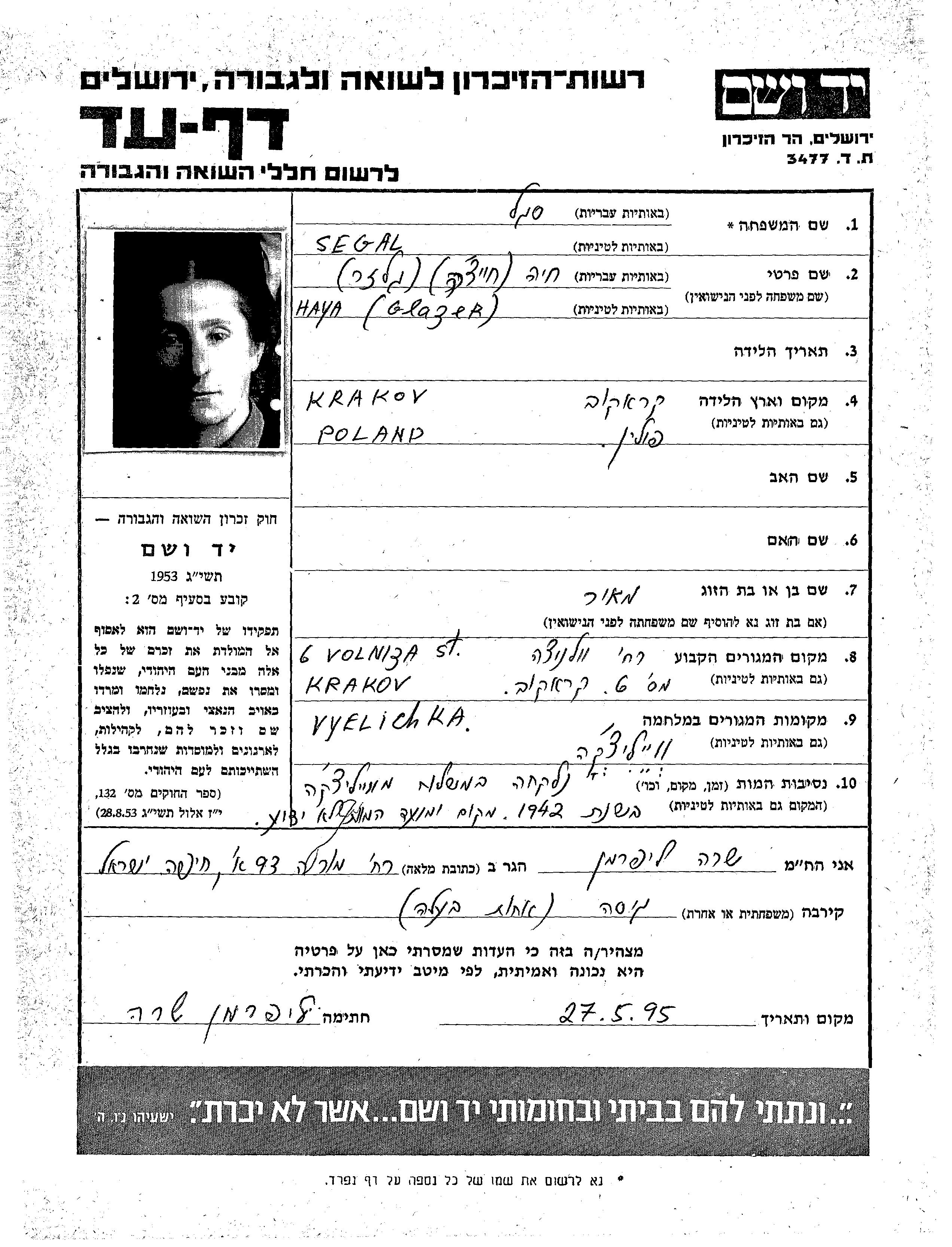 Сегаль Хая Краков, Польша Лист свидетельских показаний