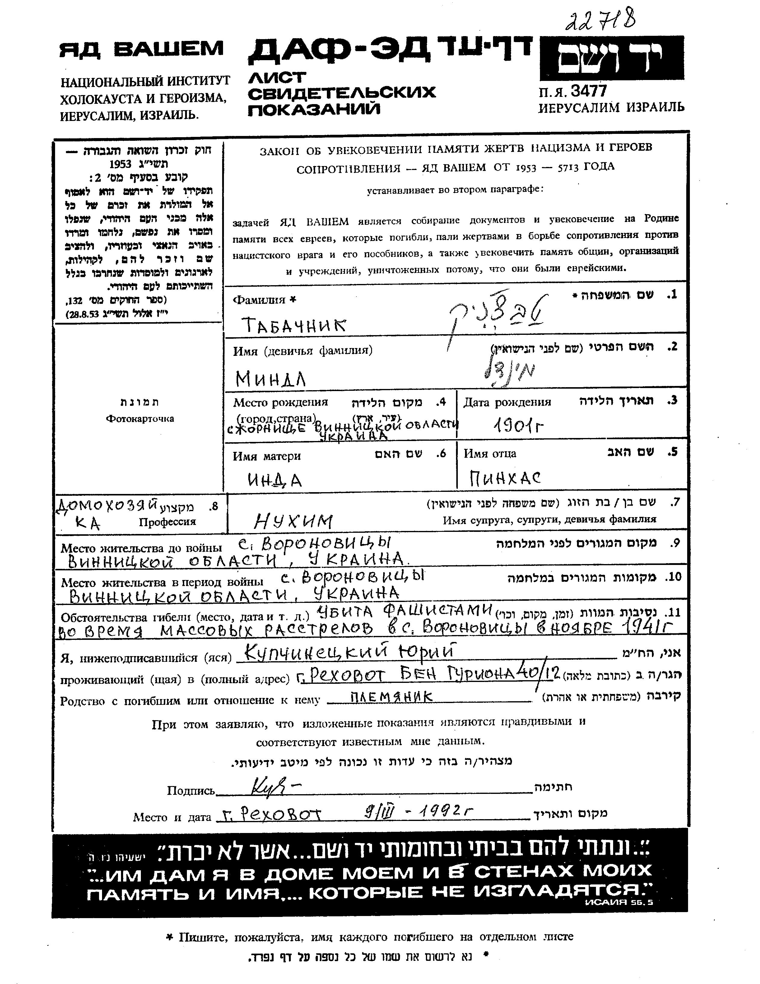 Миндл Табачник, место рождения: Жорнище, Украина (СССР). Отец: Пинхас, mать:Инда. Домохозяйка. Женат / замужем. Место жительства до войны: Вороновица, Украина (СССР). Место во время войны: Вороновица, Украина (СССР).