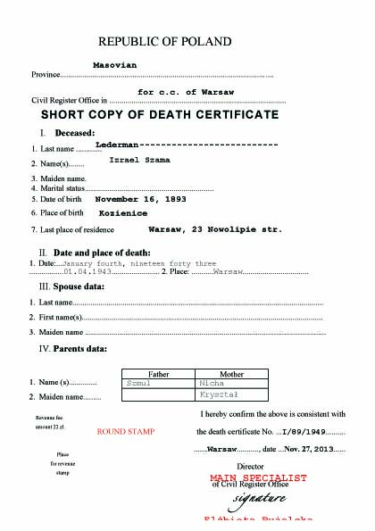Исраэль Шама Ледерман, место рождения: Козенице, Польша. Торговец кожами. Место жительства до войны: Варшава, Польша.