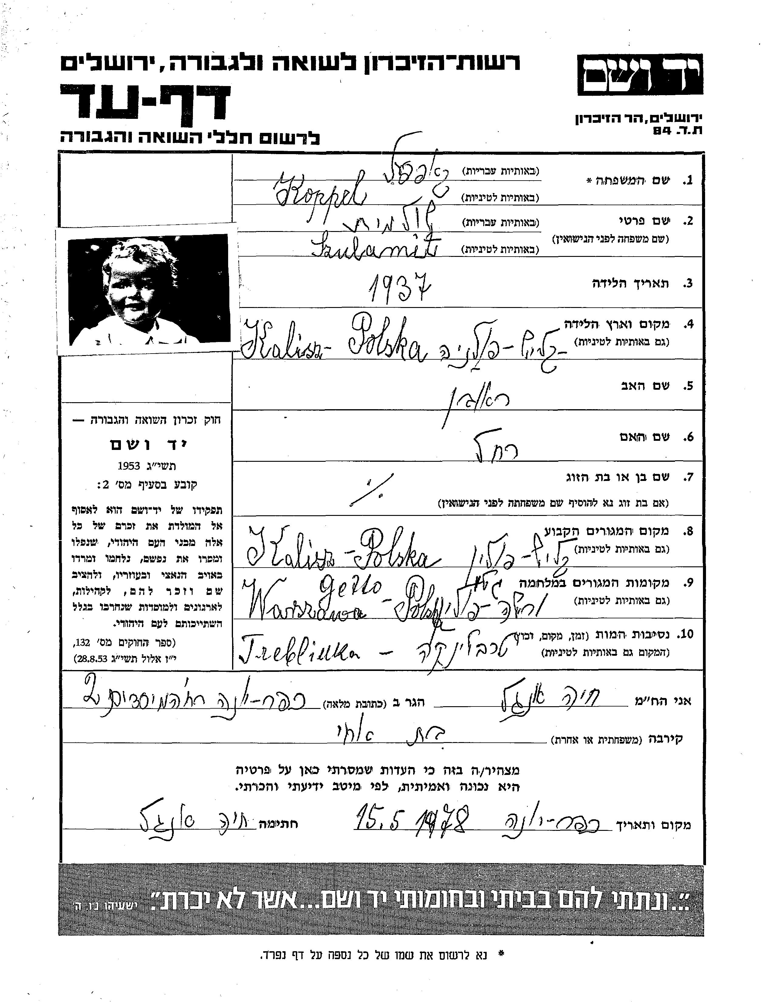 Коппель Шуламит 1937 Калиш, Польша Лист свидетельских показаний