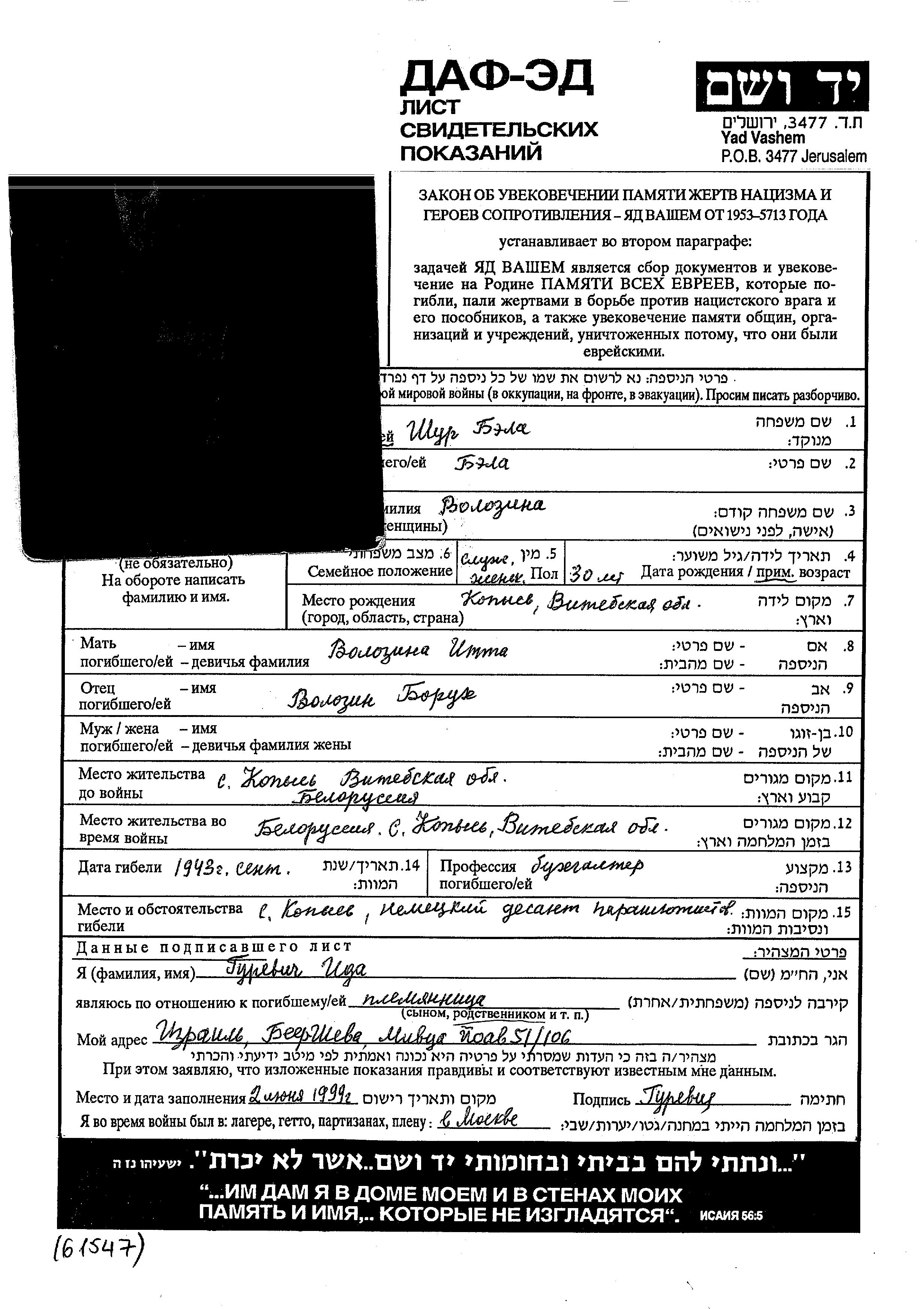 Яд Вашем - Листы свидетельских показаний Мемориального фонда