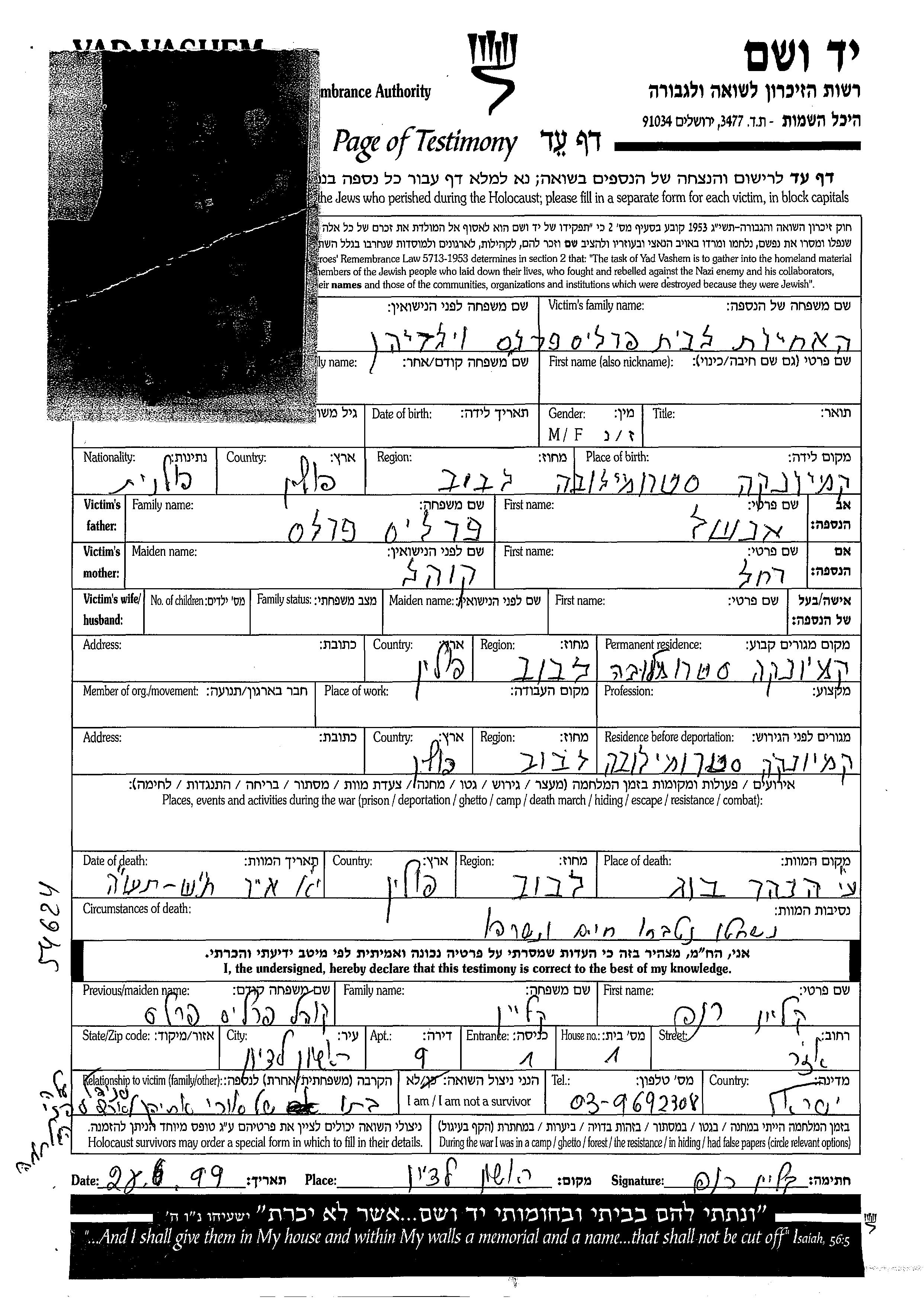 Перелес Ферлес | Имя неизвестно | Камёнка Струмилова, Польша | Лист свидетельских показаний | |