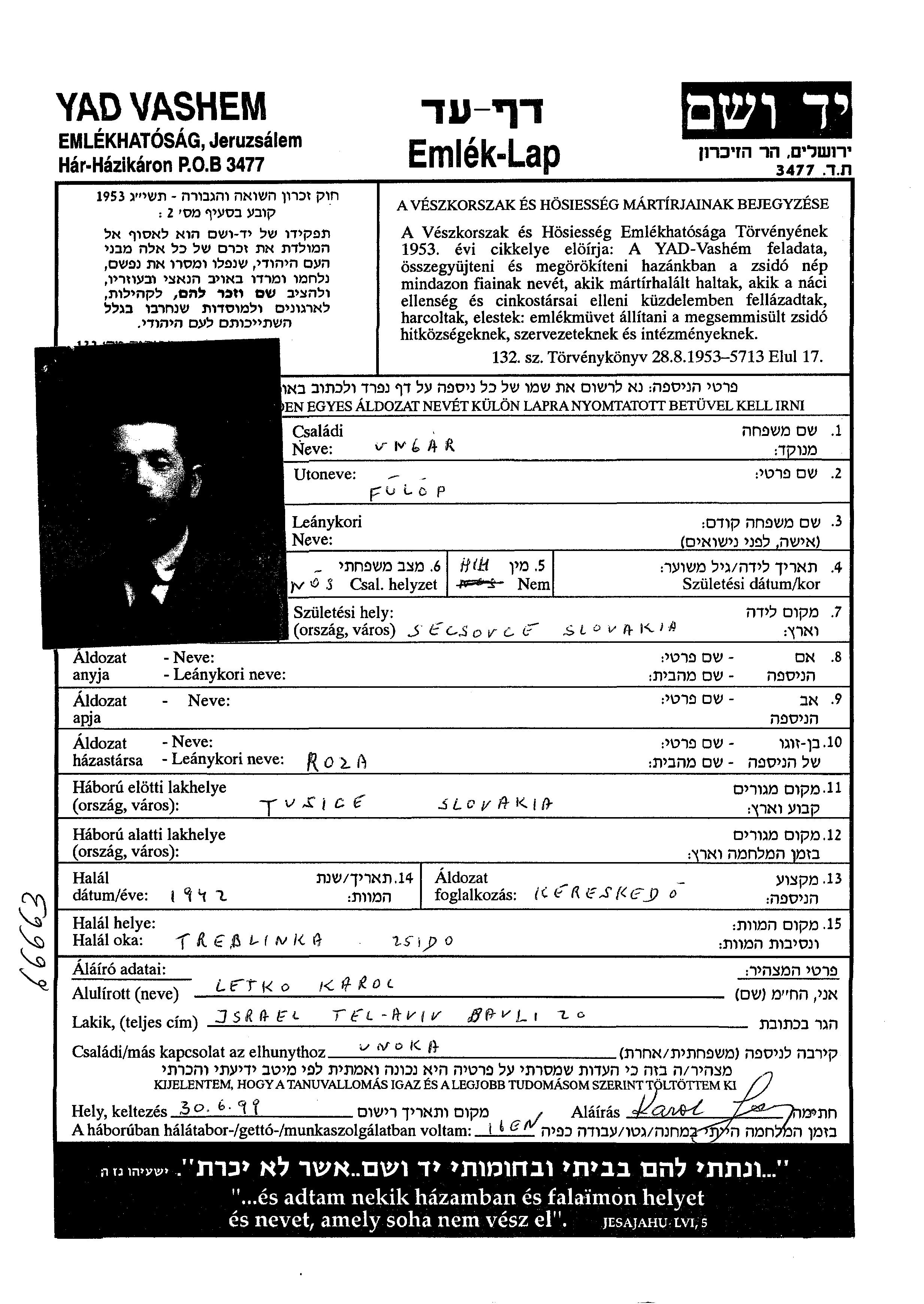 Унгер Фюлёп Тушице, Чехословакия Лист свидетельских показаний