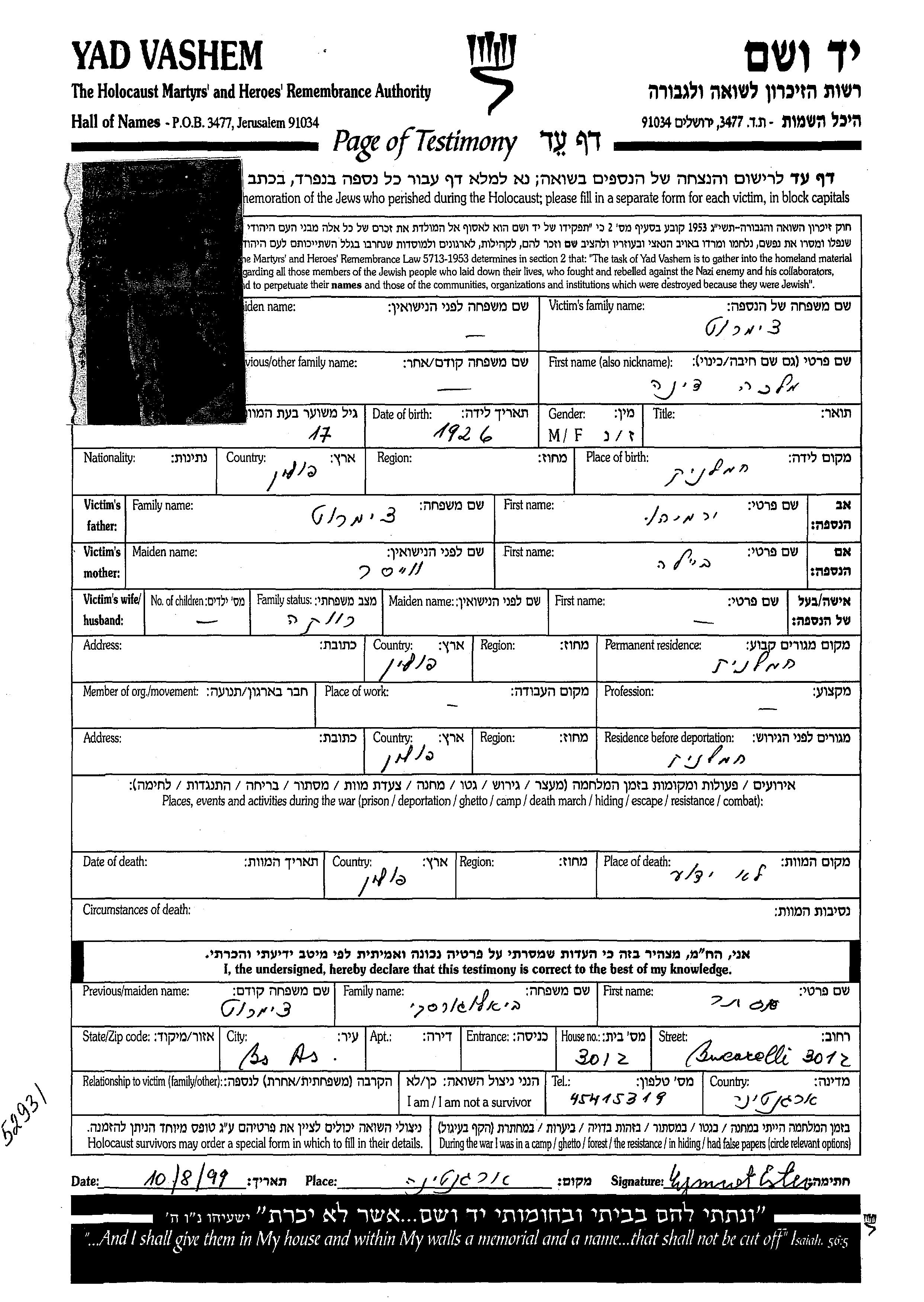 | Цимрод | Малка Дина | 1926 | Хмельник, Польша | Лист свидетельских показаний |