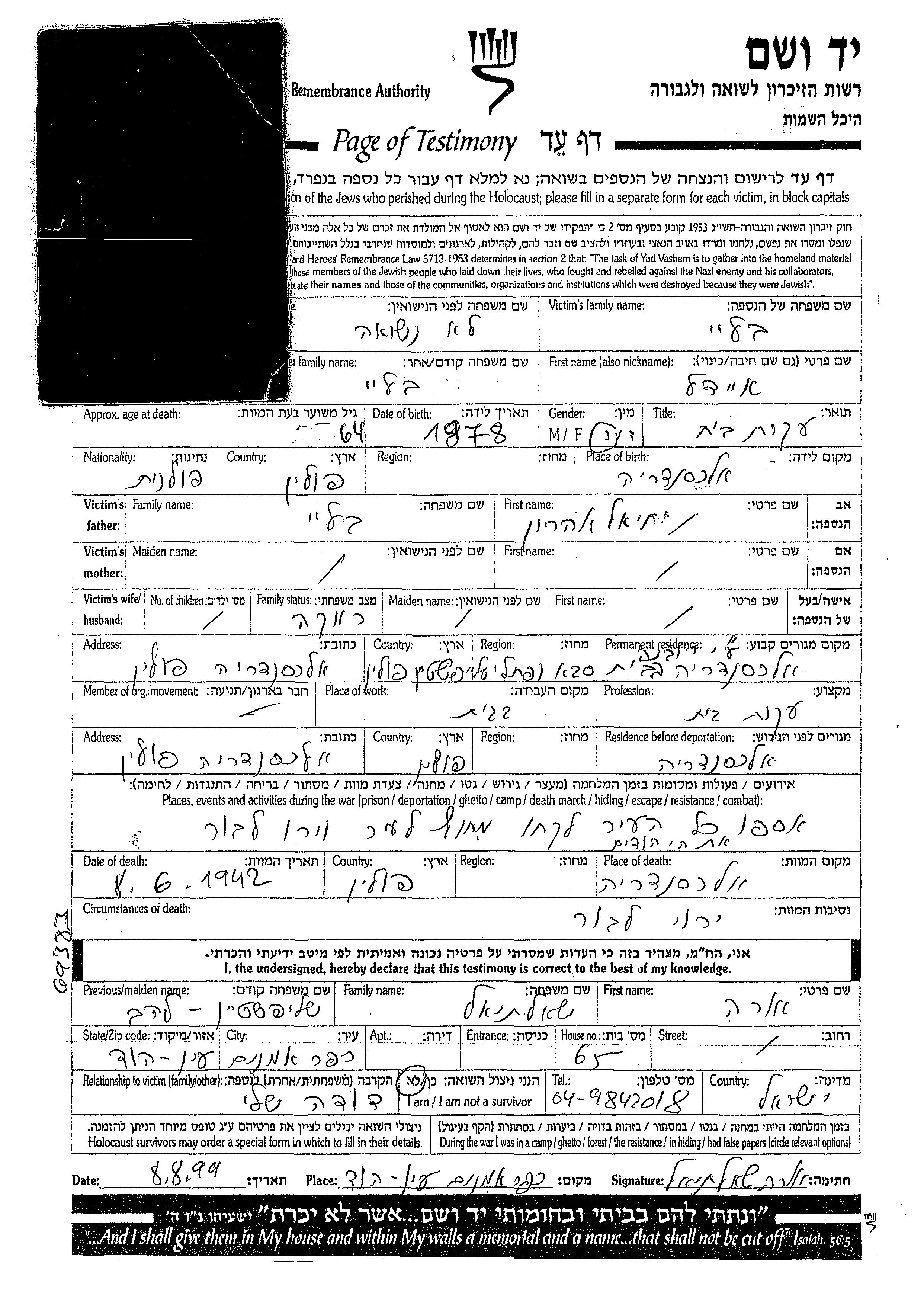 Эйдл уничтоженa в период Шоа. место смерти: Александрия, Польша в 1942.