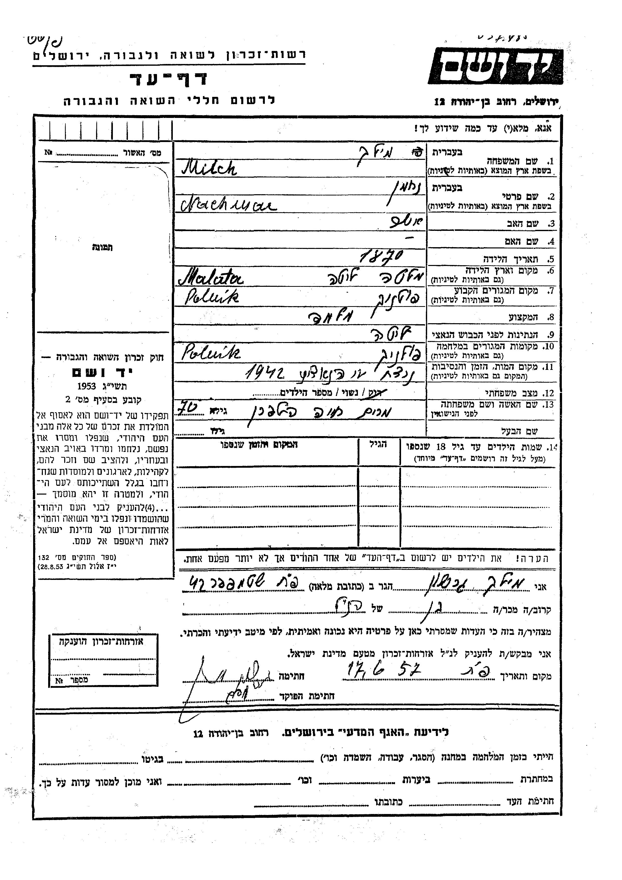 Яд Вашем - Листы свидетельских показаний Мемориального фонда