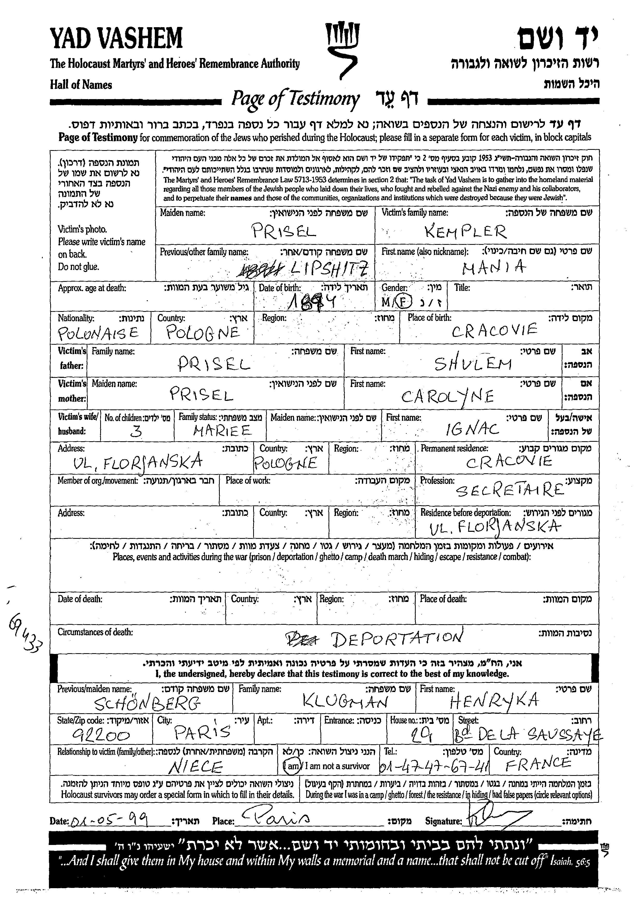 Кемплер Липшиц | Маня | 1894 | Краков, Польша | Лист свидетельских показаний |