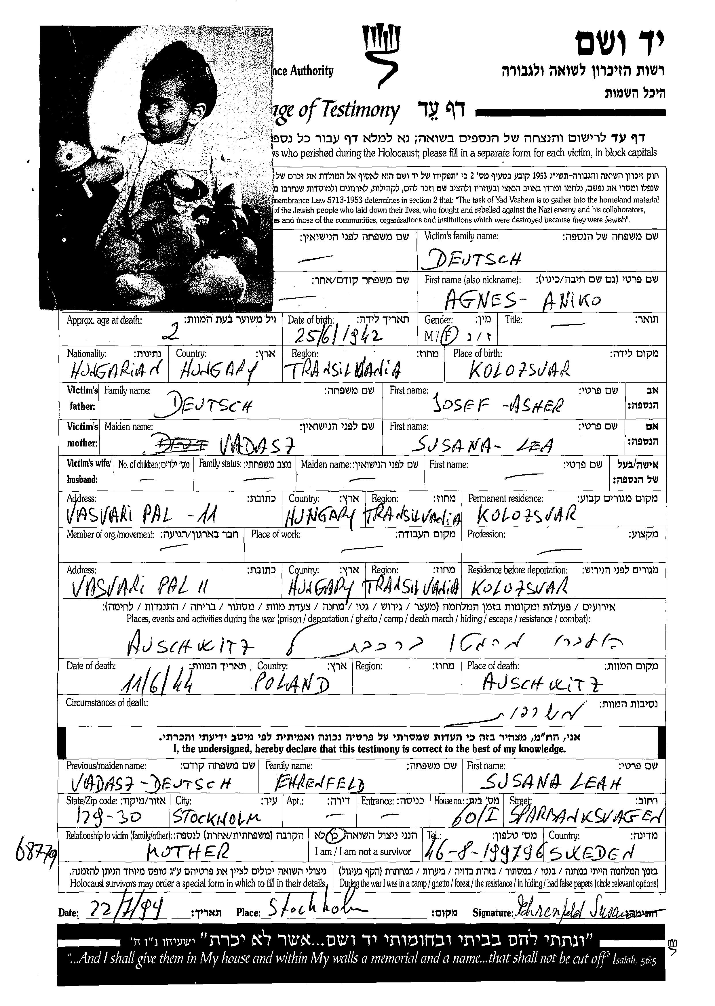 Дойч Агнес Ана 1942 Коложвар, Румыния Лист свидетельских показаний