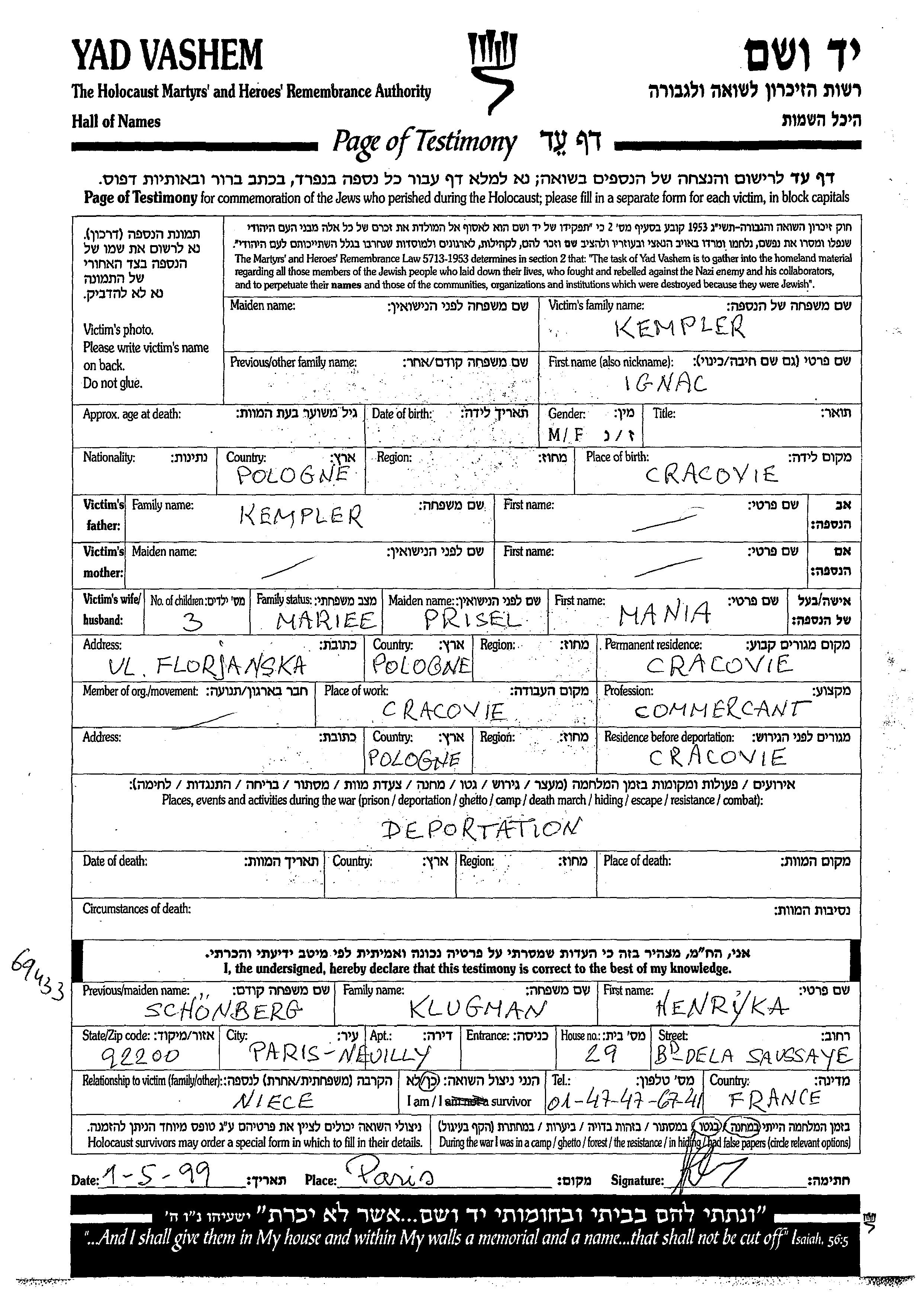 Кемплер Игнац Краков, Польша Лист свидетельских показаний