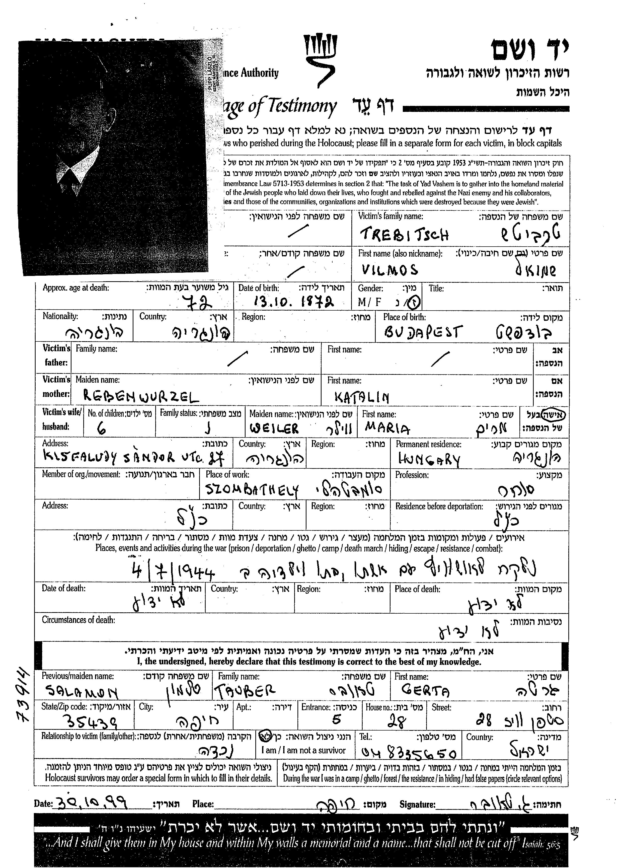 Вильмош Шмуэль Требич, место рождения: Будапешт, Венгрия. Торговец / торговка. Место жительства до войны: Сомбатхей, Венгрия.