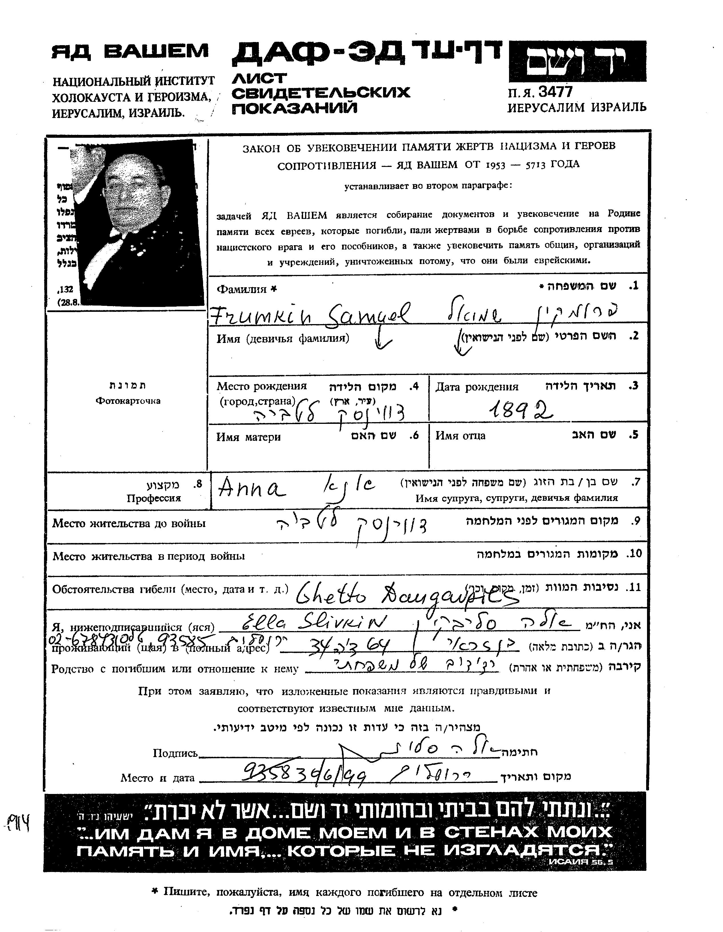 Фрумкин Шмуэль 1892 Двинск, Латвия Лист свидетельских показаний