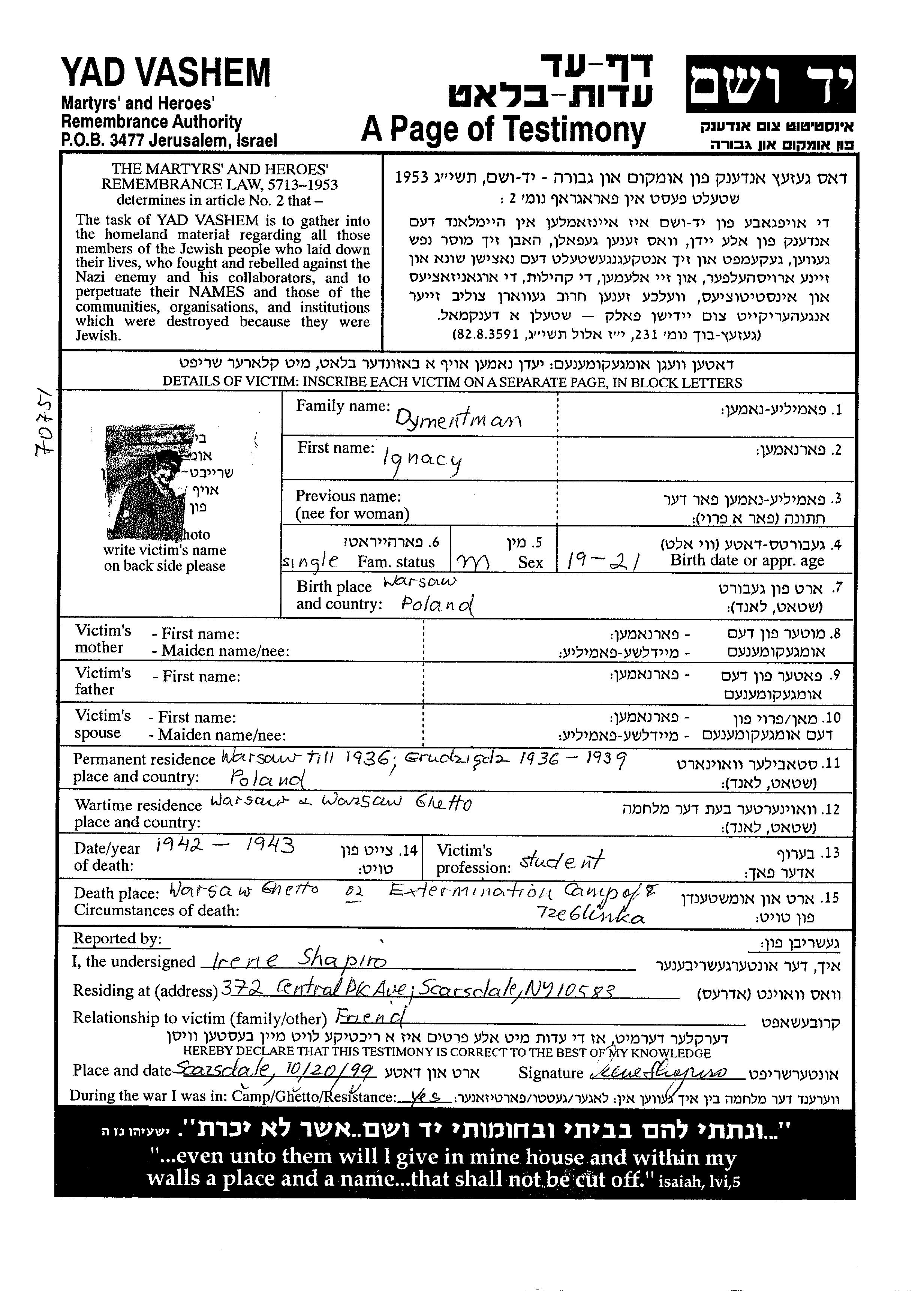 Диментман Игнаци Варшава, Польша Лист свидетельских показаний