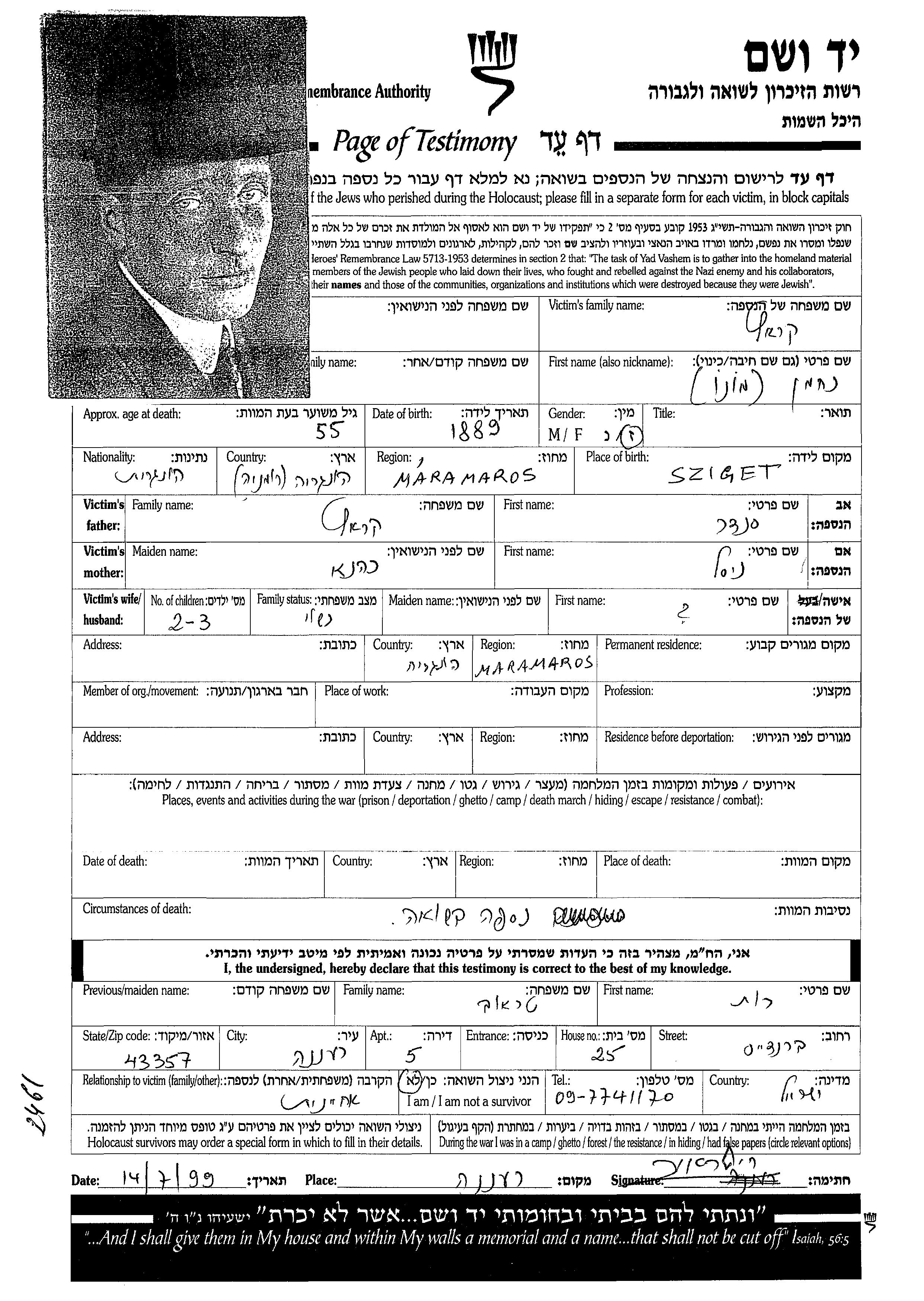 Нахман Моно Крац, место рождения: Сигет, Румыния. Место жительства до войны: Румыния.