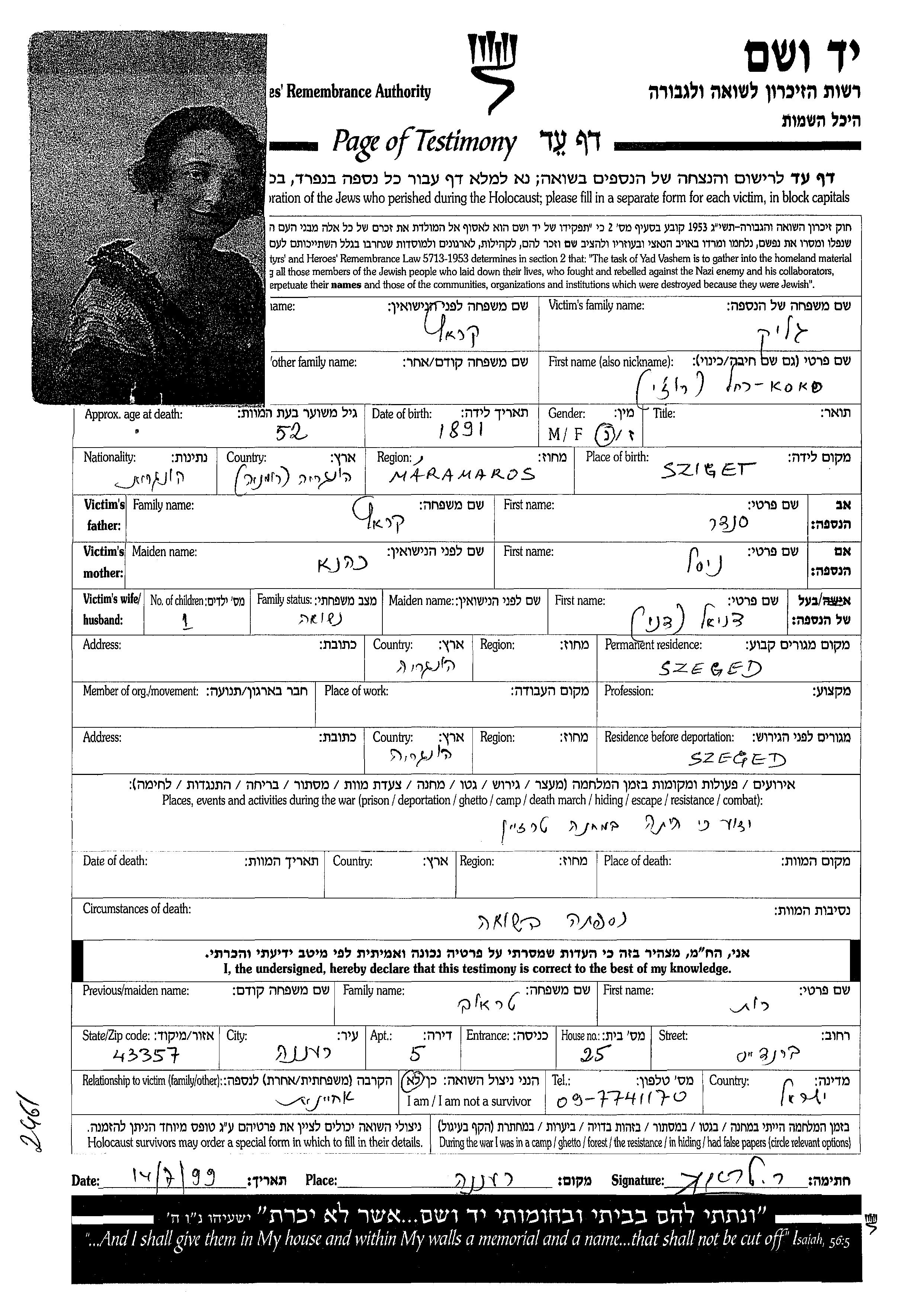 Глик | Соса Рахель Рози | 1891 | Сигет, Румыния | Лист свидетельских показаний |