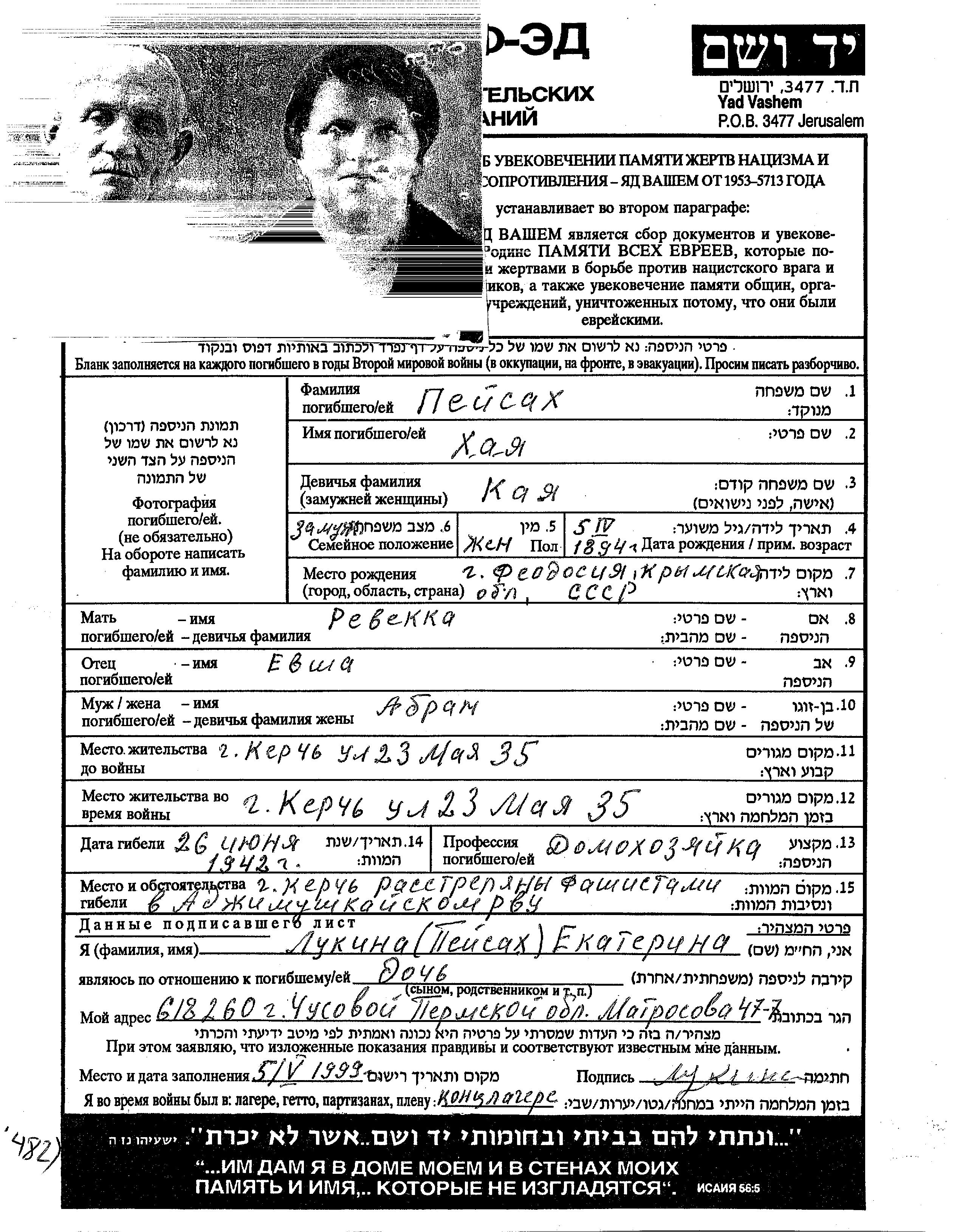 Пейсах | Хая | 1894 | Керчь, Россия (СССР) | Лист свидетельских показаний |