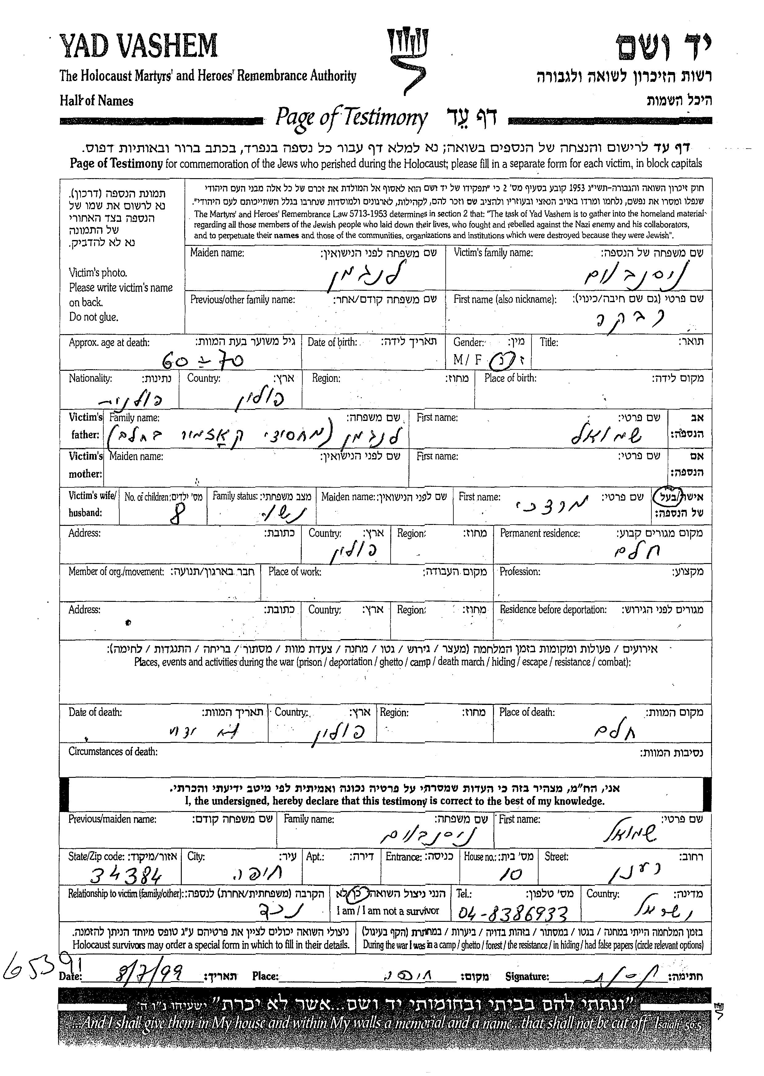 Нисенбойм Ривка Хелм, Польша Лист свидетельских показаний
