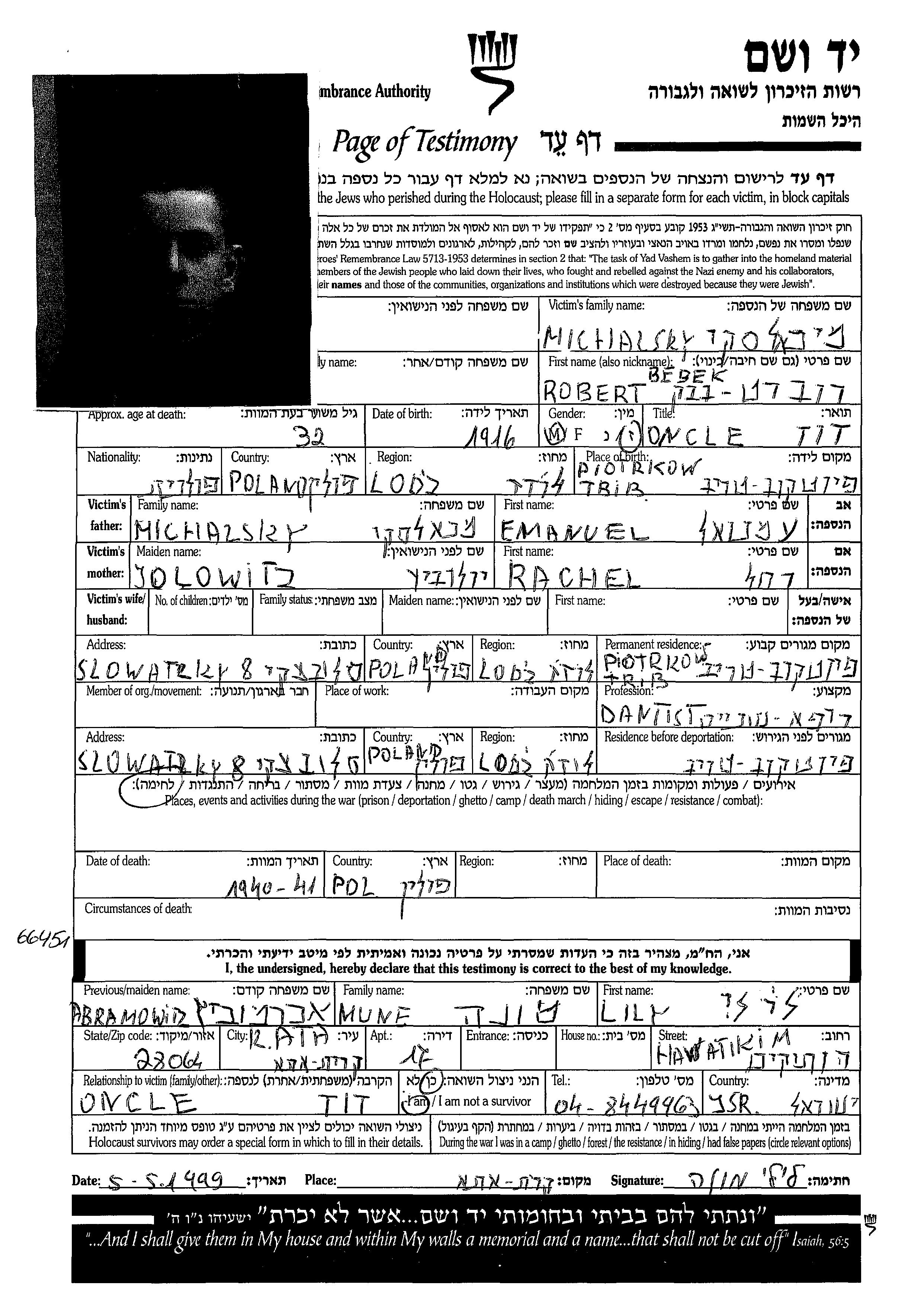 | Михальски | Берек Роберт | 1916 | Пётркув-Трыбунальски, Польша | Лист свидетельских показаний |