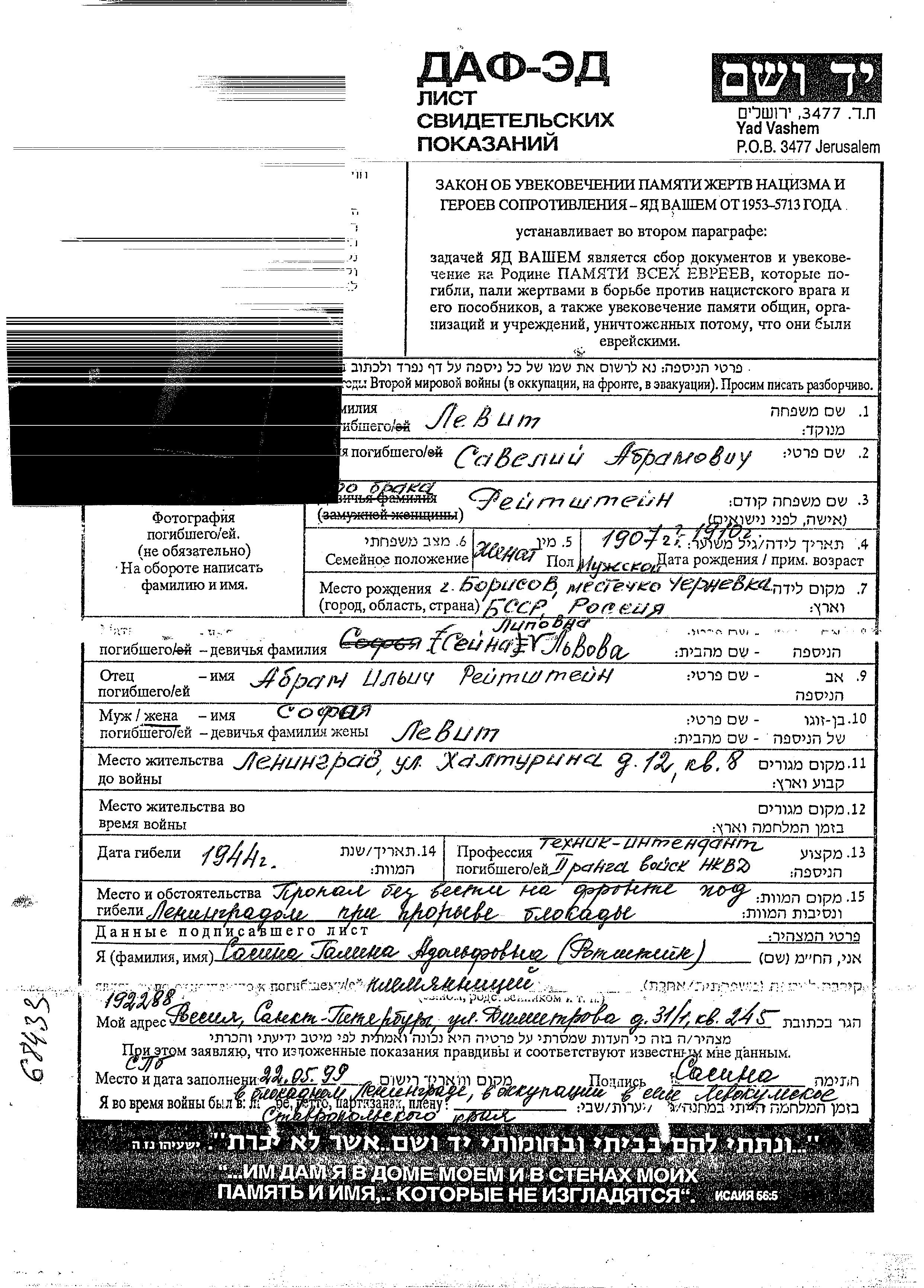 Яд Вашем - Листы свидетельских показаний Мемориального фонда