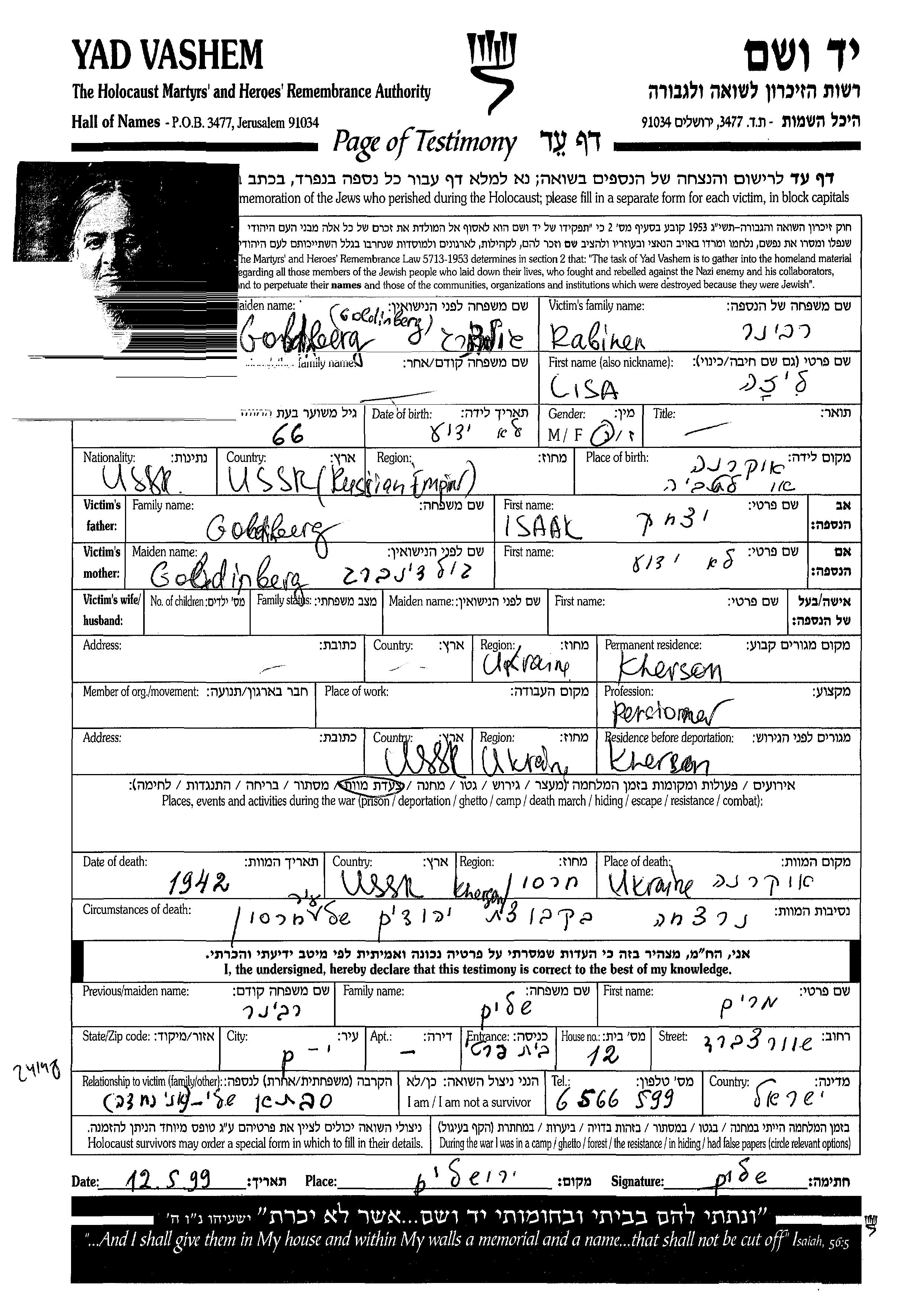 Рабинер Лиза Херсон, Украина (СССР) Лист свидетельских показаний