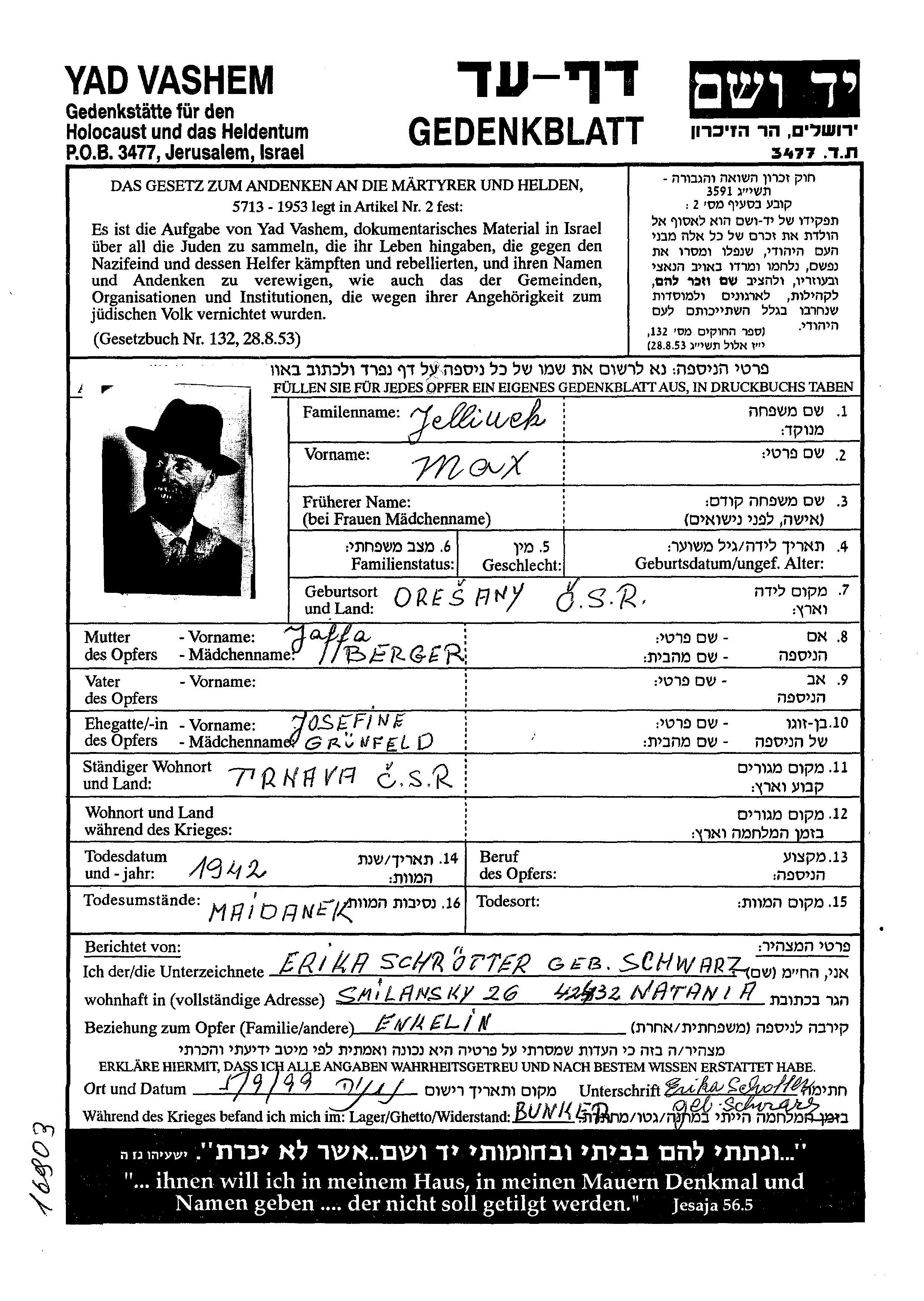 Макс Еллинек, место рождения: Орешаны, Чехословакия. Место жительства до войны: Трнава, Чехословакия.
