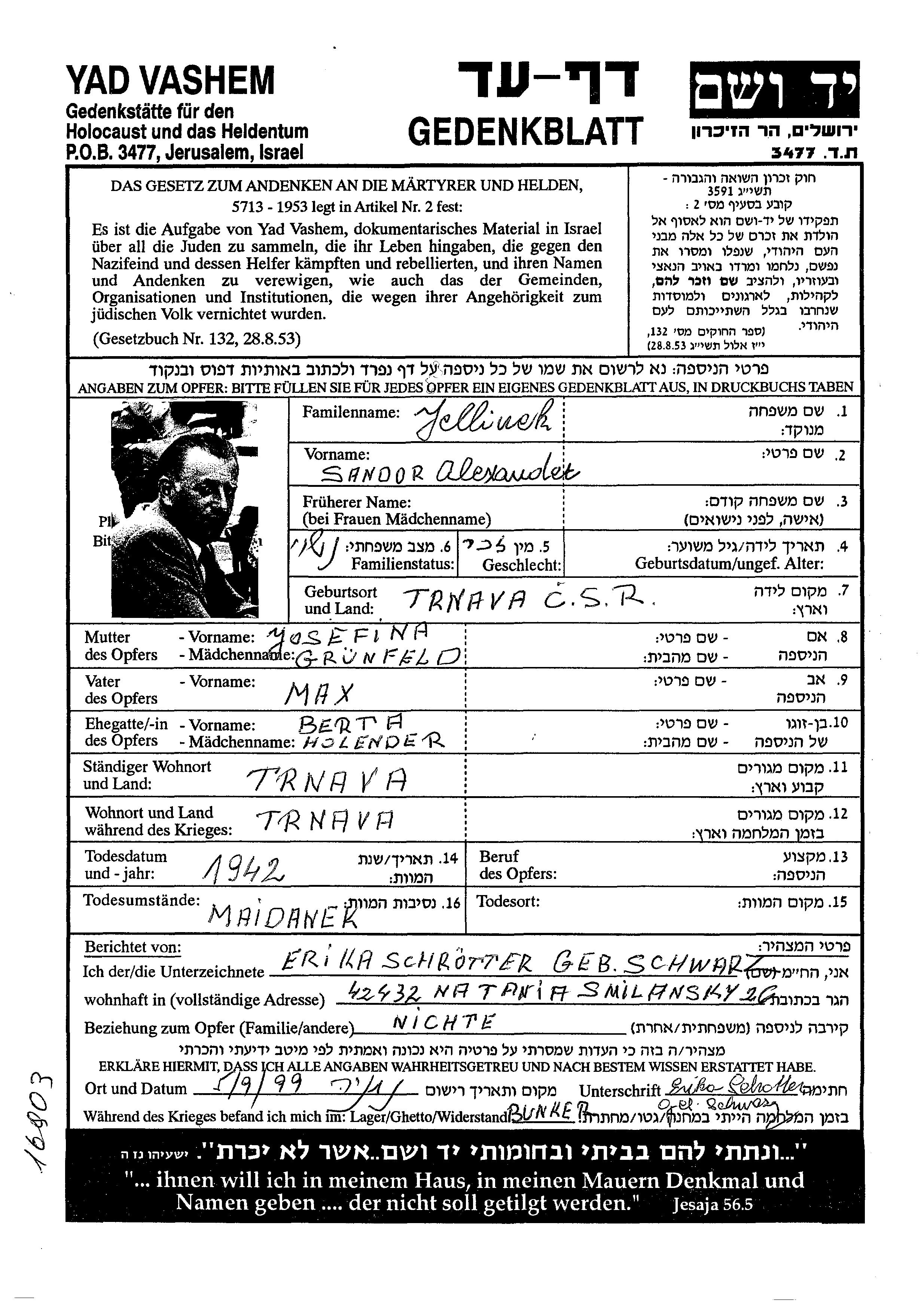 | Еллинек | Сандор | Трнава, Чехословакия | Лист свидетельских показаний | |