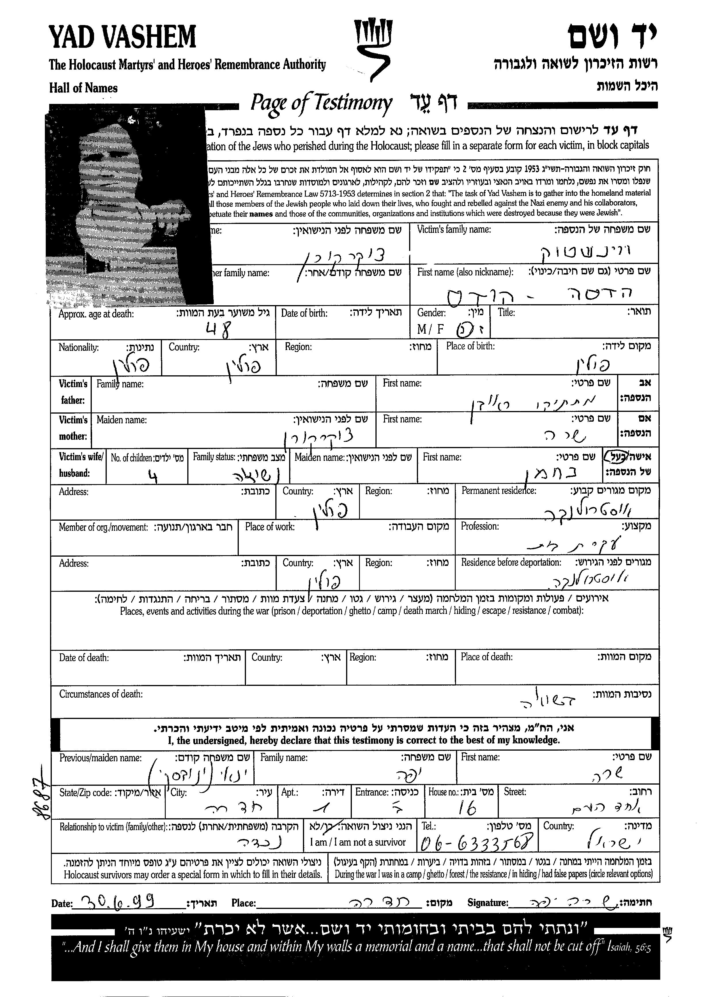 Вайншток Хадаса Остроленка, Польша Лист свидетельских показаний