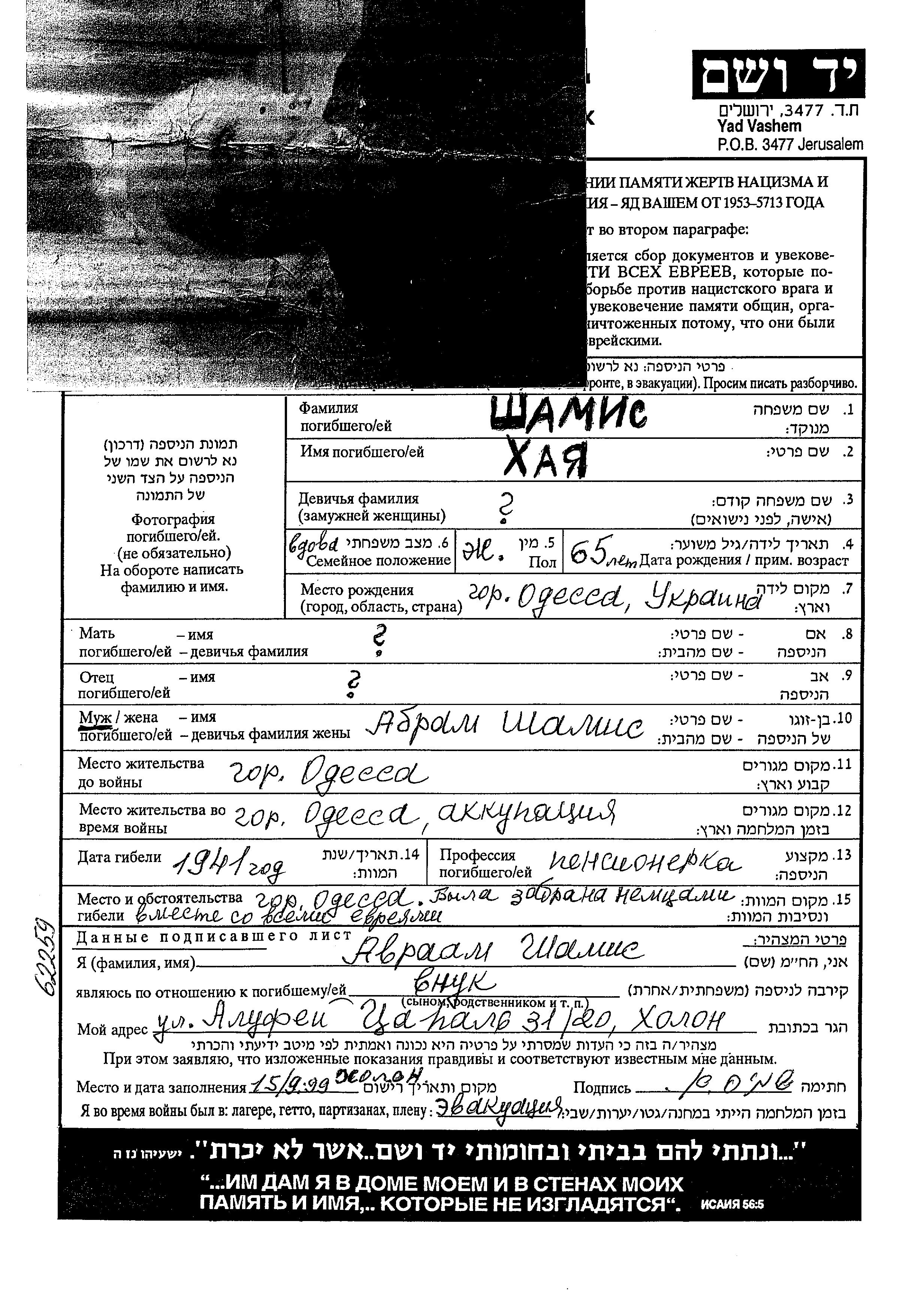 Шамис Хая Одесса, Украина (СССР) Лист свидетельских показаний