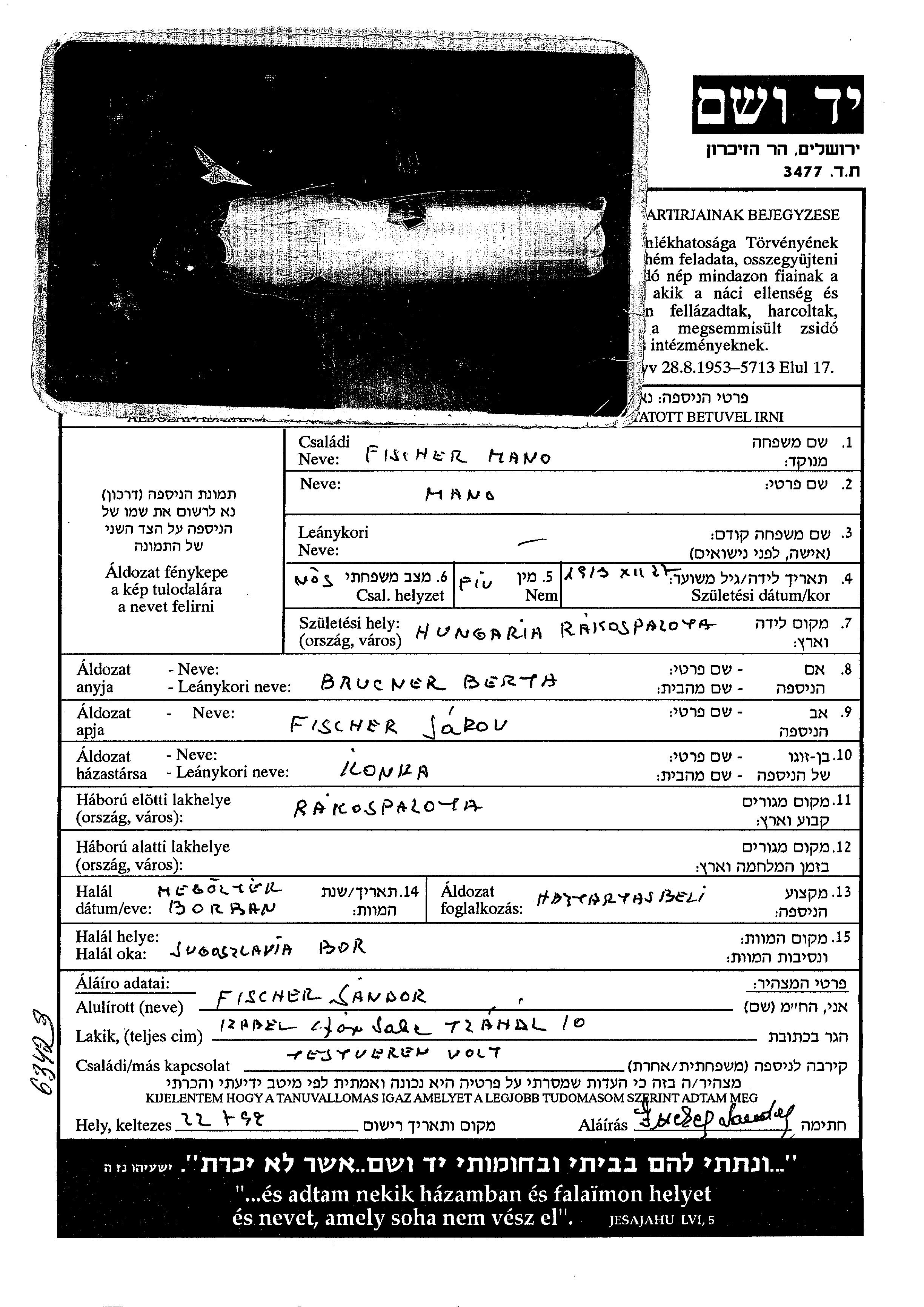 Мано Фишер, место рождения: Ракошпалота, Венгрия. Место жительства до войны: Ракошпалота, Венгрия.