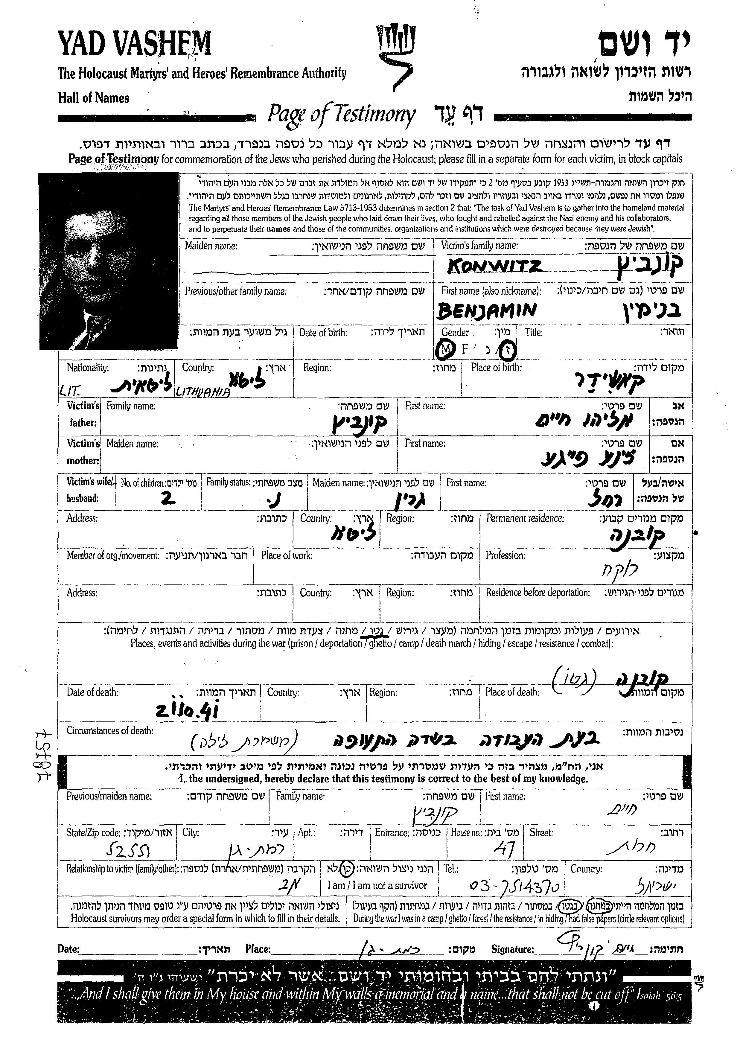| Конвиц | Беньямин | Каунас, Литва | Лист свидетельских показаний | |