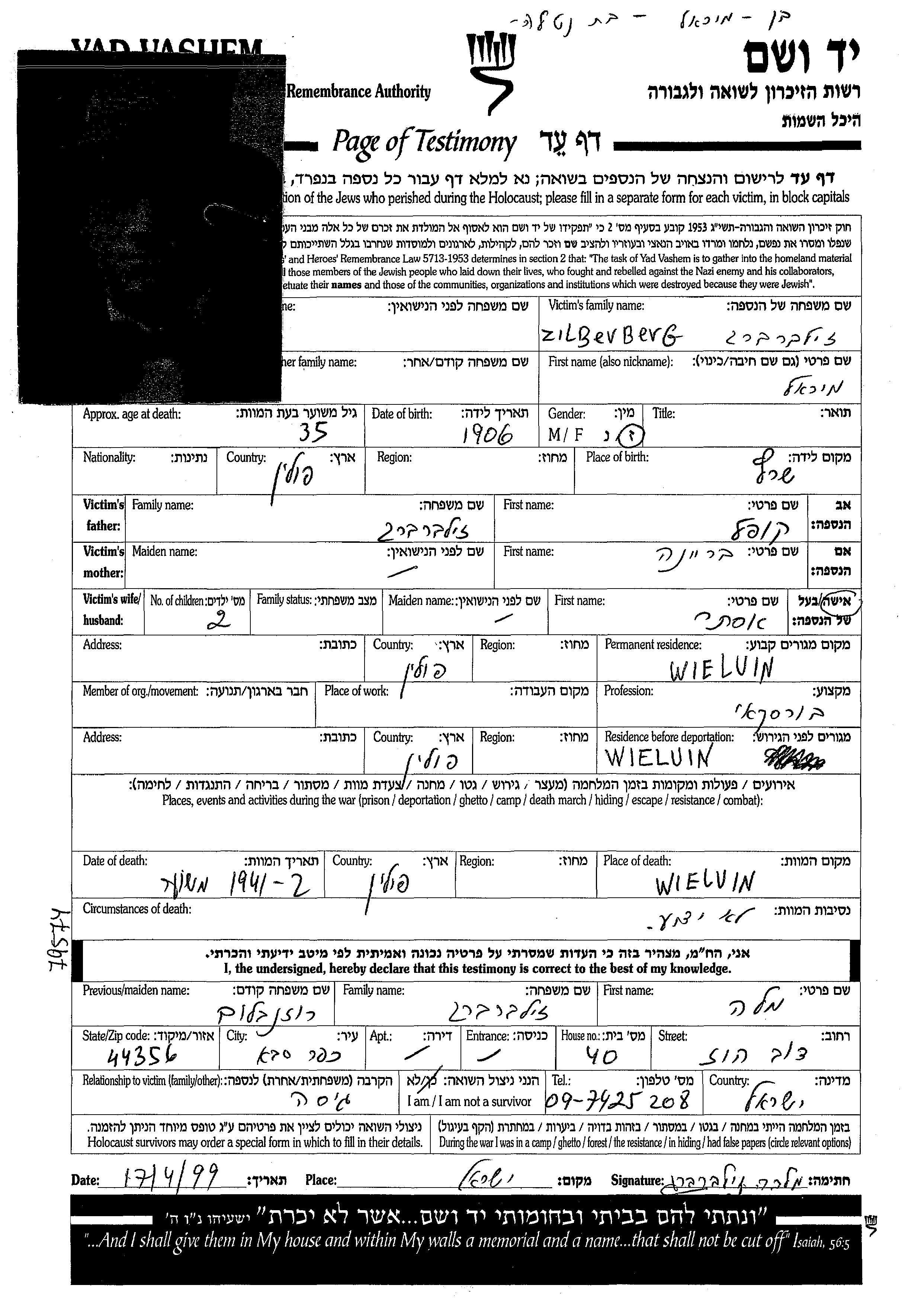 Зильберберг Михаэль 1906 Велюнь, Польша Лист свидетельских показаний