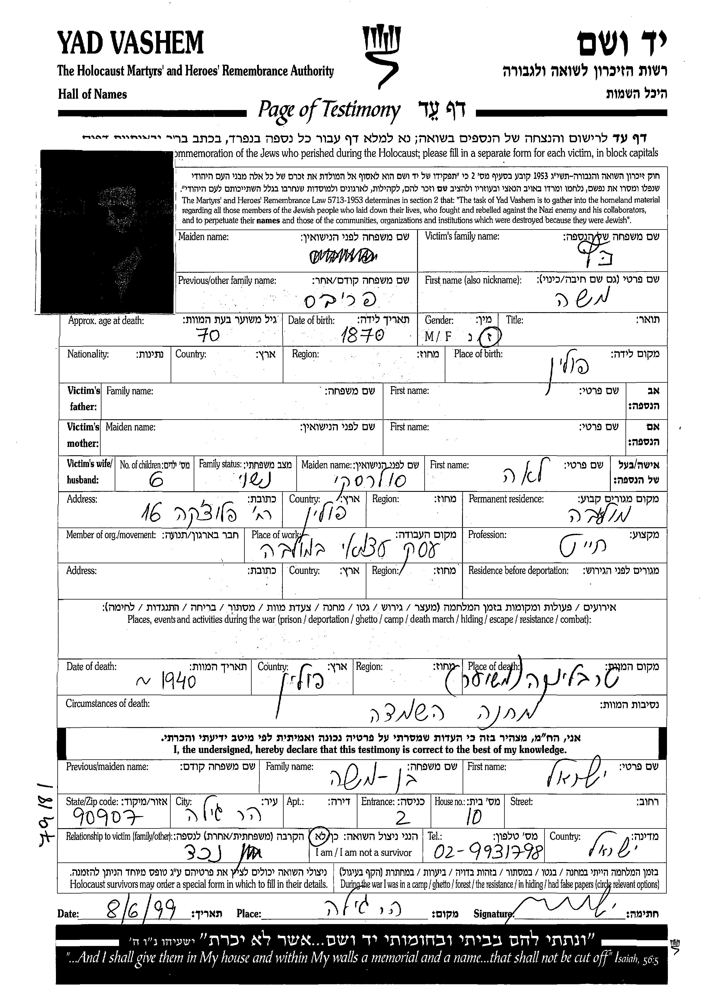 Моше уничтожен в период Шоа. место смерти: Треблинка, Польша в 1940.