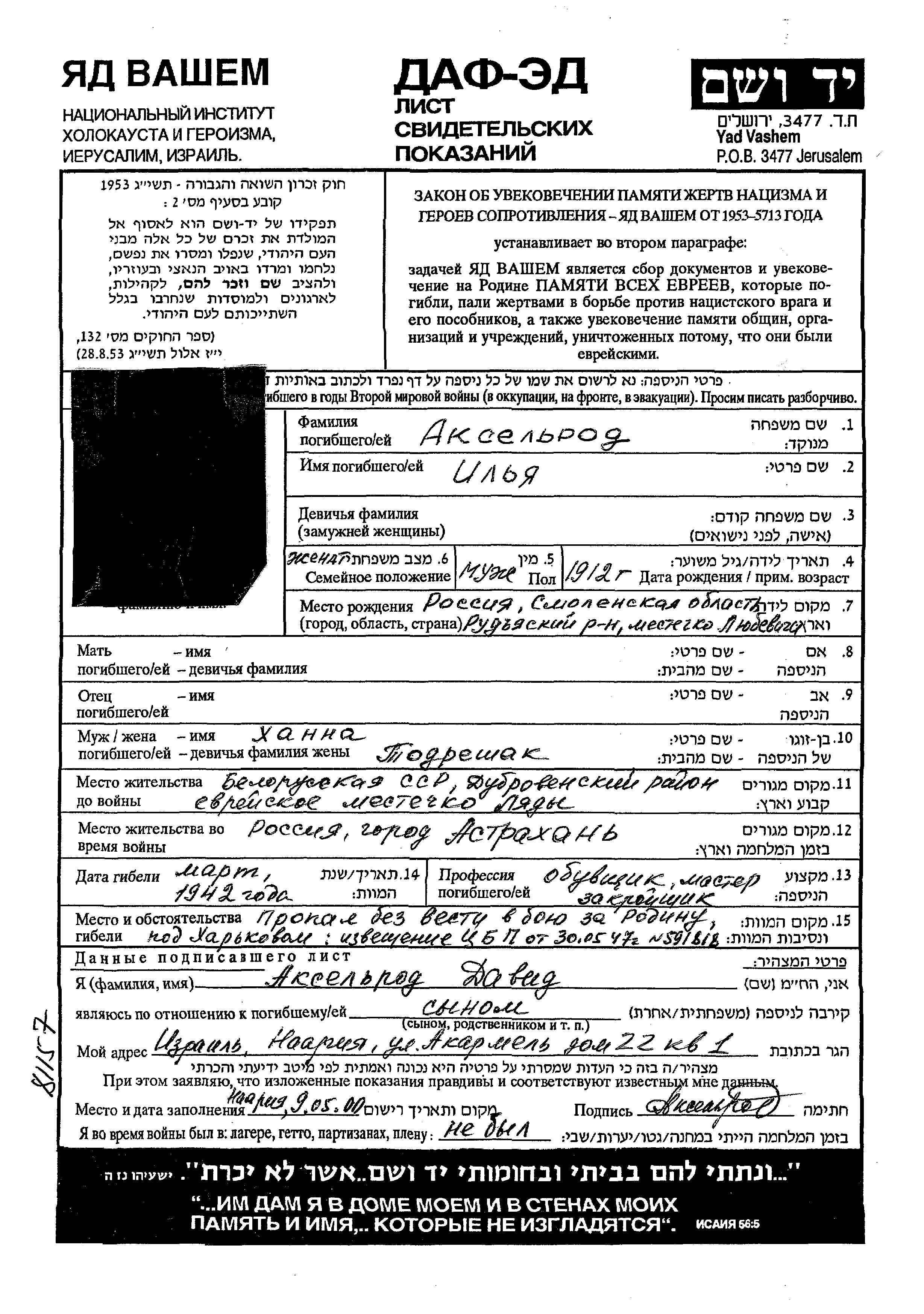 Аксельрад Илья 1912 Ляды, Белоруссия (СССР) Лист свидетельских показаний