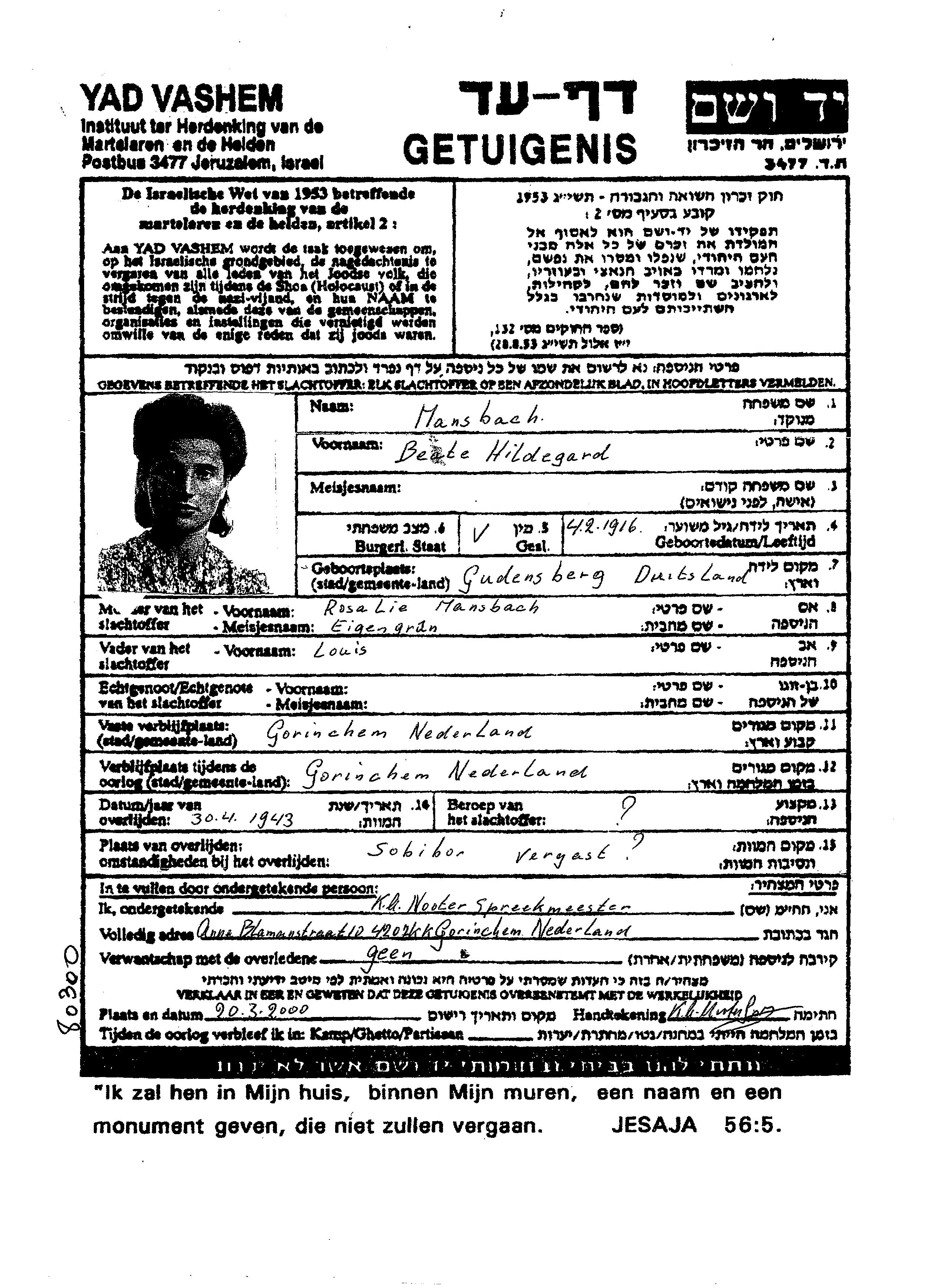 Мансбах Берте Хильдегард 1916 Горинхем, Нидерланды Лист свидетельских показаний